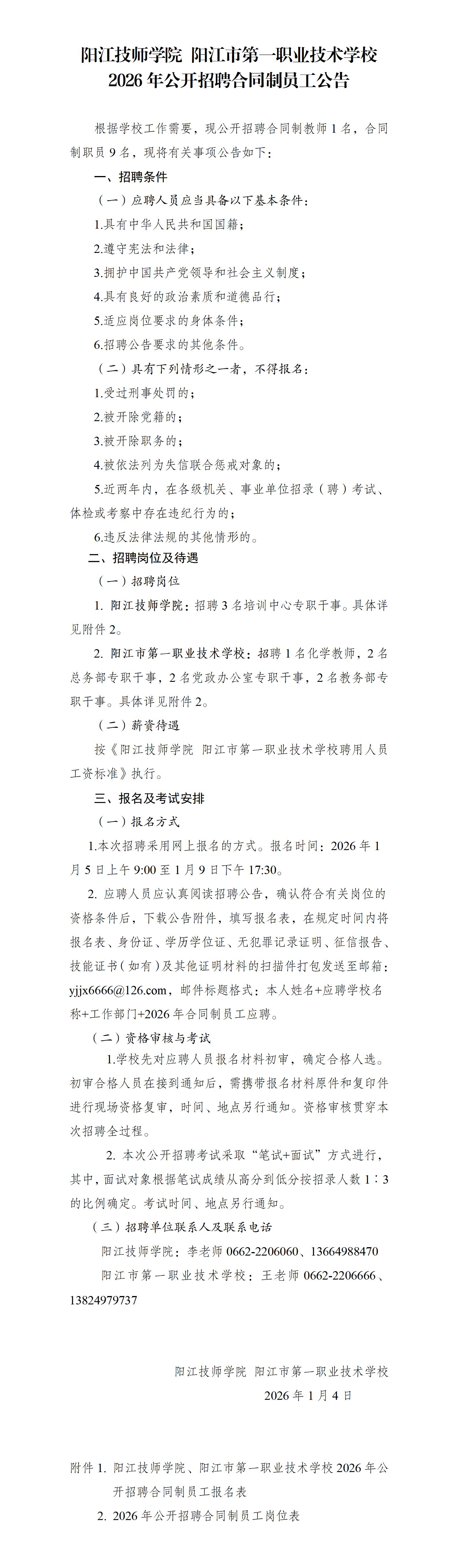 阳江技师学院 阳江市第一职业技术学校 2026年公开招聘合同制员工公告