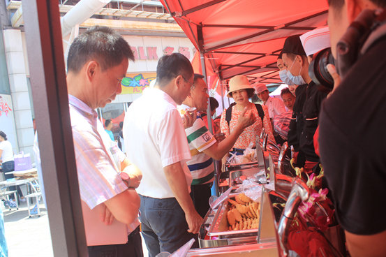(图为美食诱惑,摊位刚准备就绪,马上涌来一批市民品尝学生精心准备制作的点心)