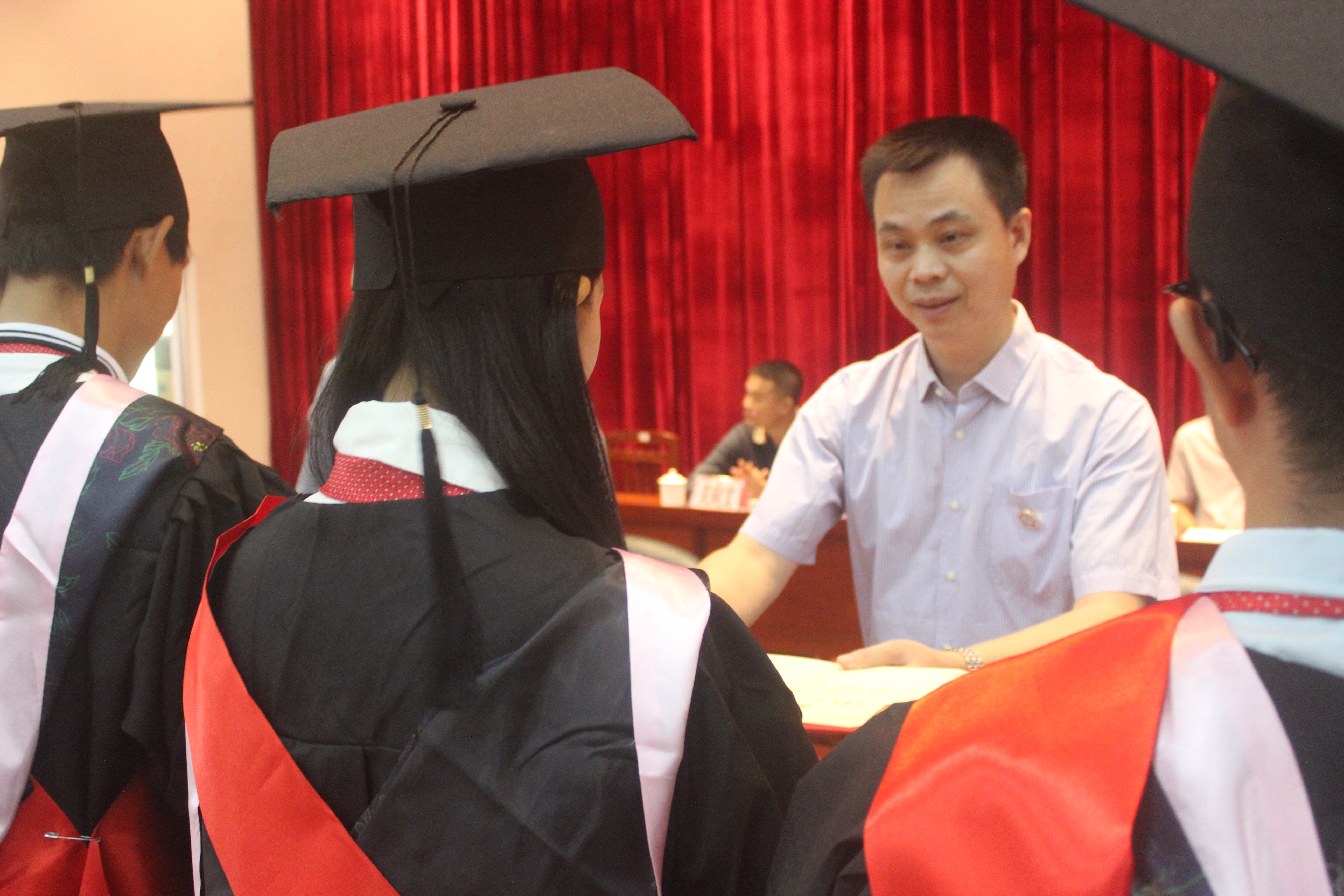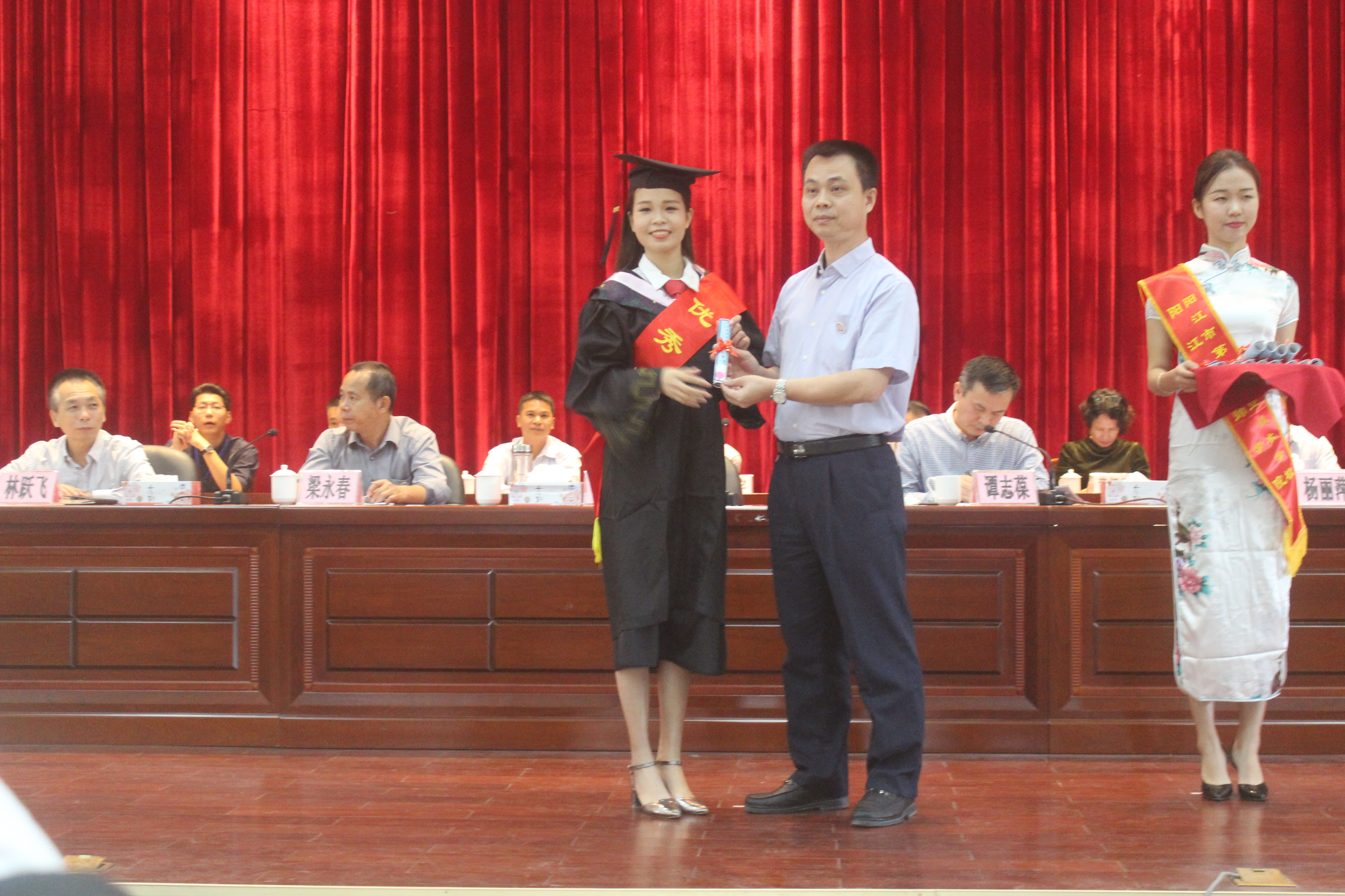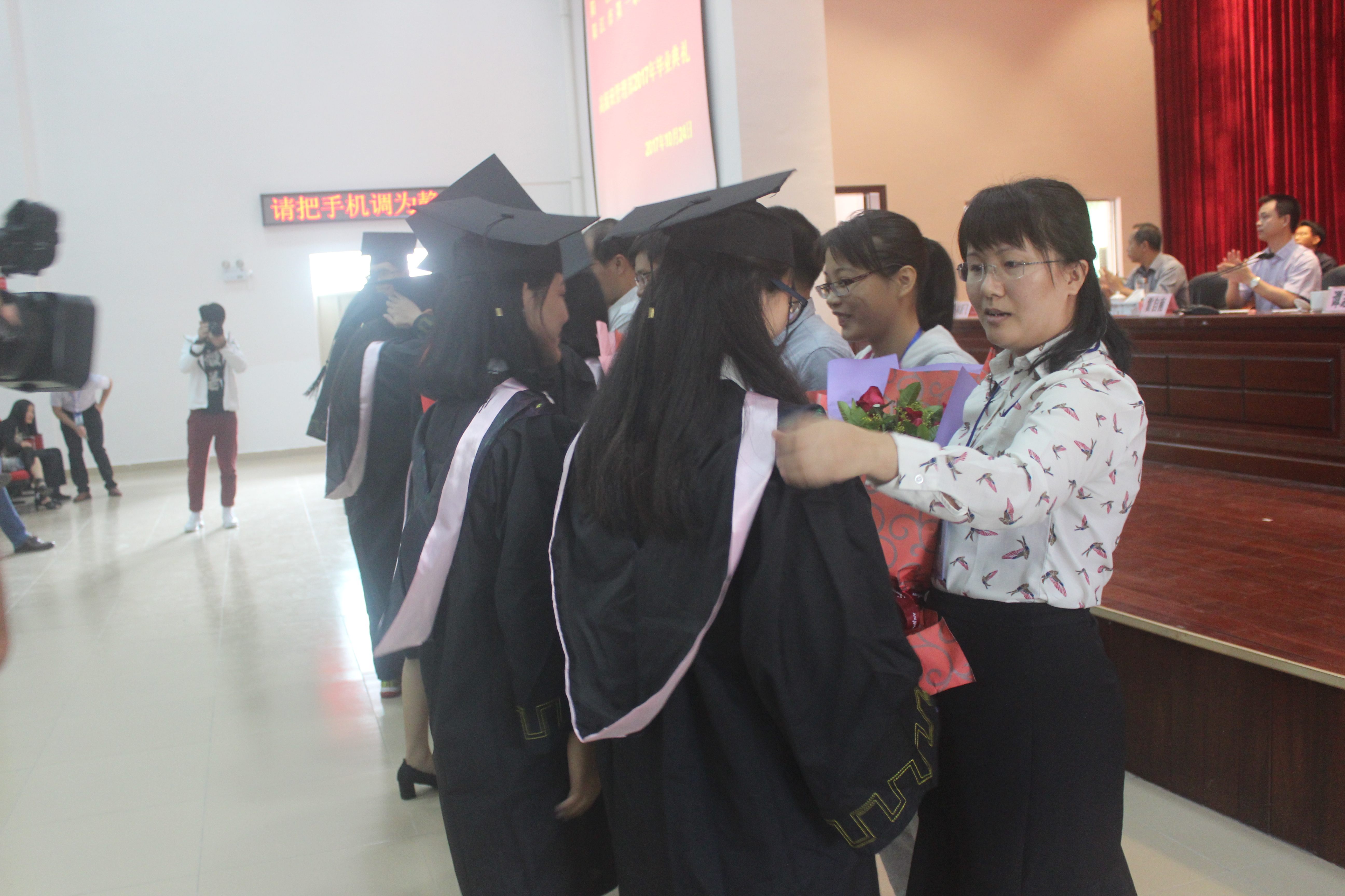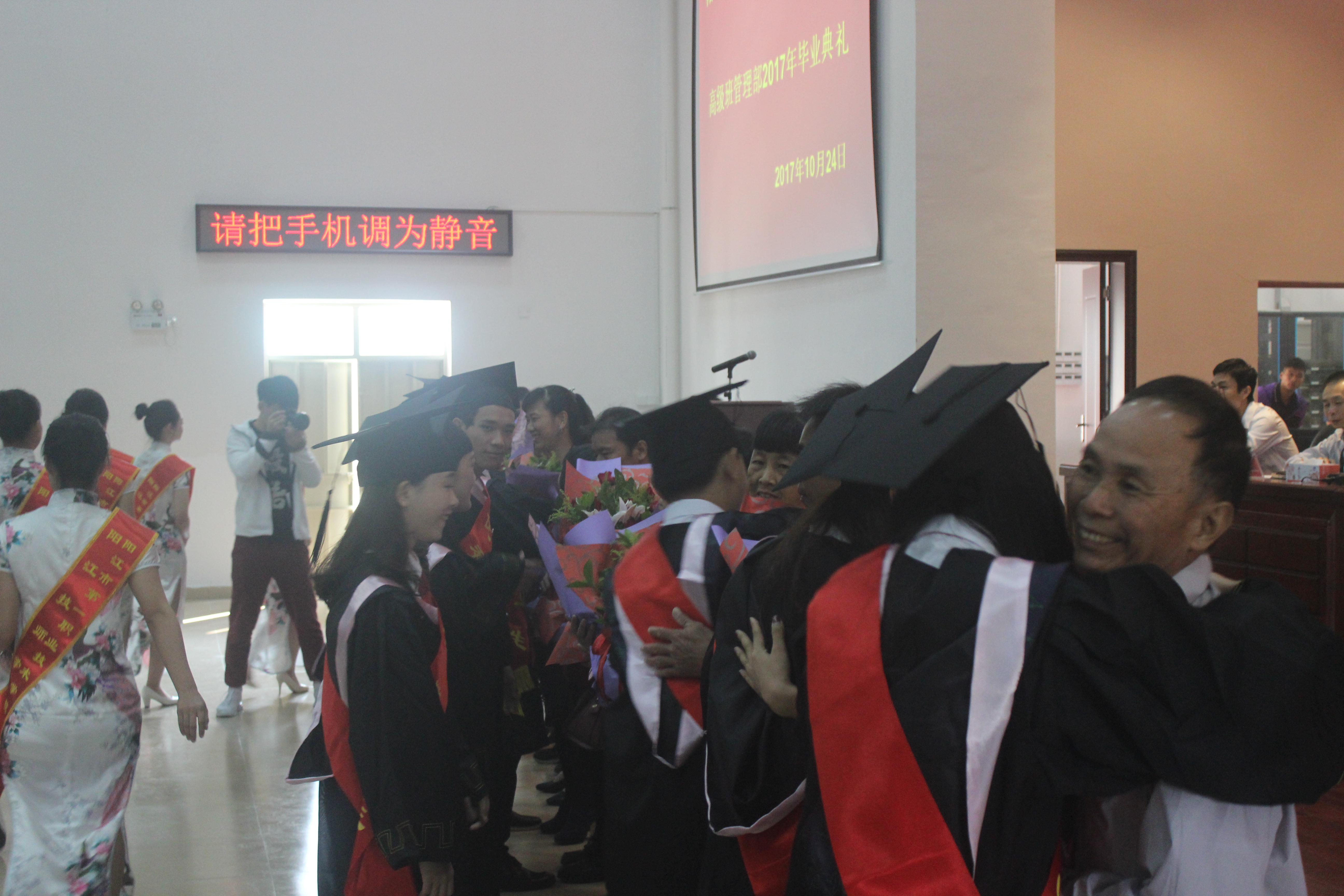 上午9时,在庄严的国歌声中,我校高级班管理部2017年毕业典礼正式拉开帷幕。副校长梁永春首先宣读了表彰高级班管理部2017年优秀毕业生的决定,之后出席毕业典礼的全体校领导为12名优秀毕业生颁发优秀奖,而为表达感恩之心,12优秀毕业生则分别向培育和养育自己的班主任与父母献上了一束束美丽的鲜花。随后,在现场师生、家长的见证下,校长雷自南亲自逐个为317名毕业生颁发毕业证书,送上毕业的祝福。