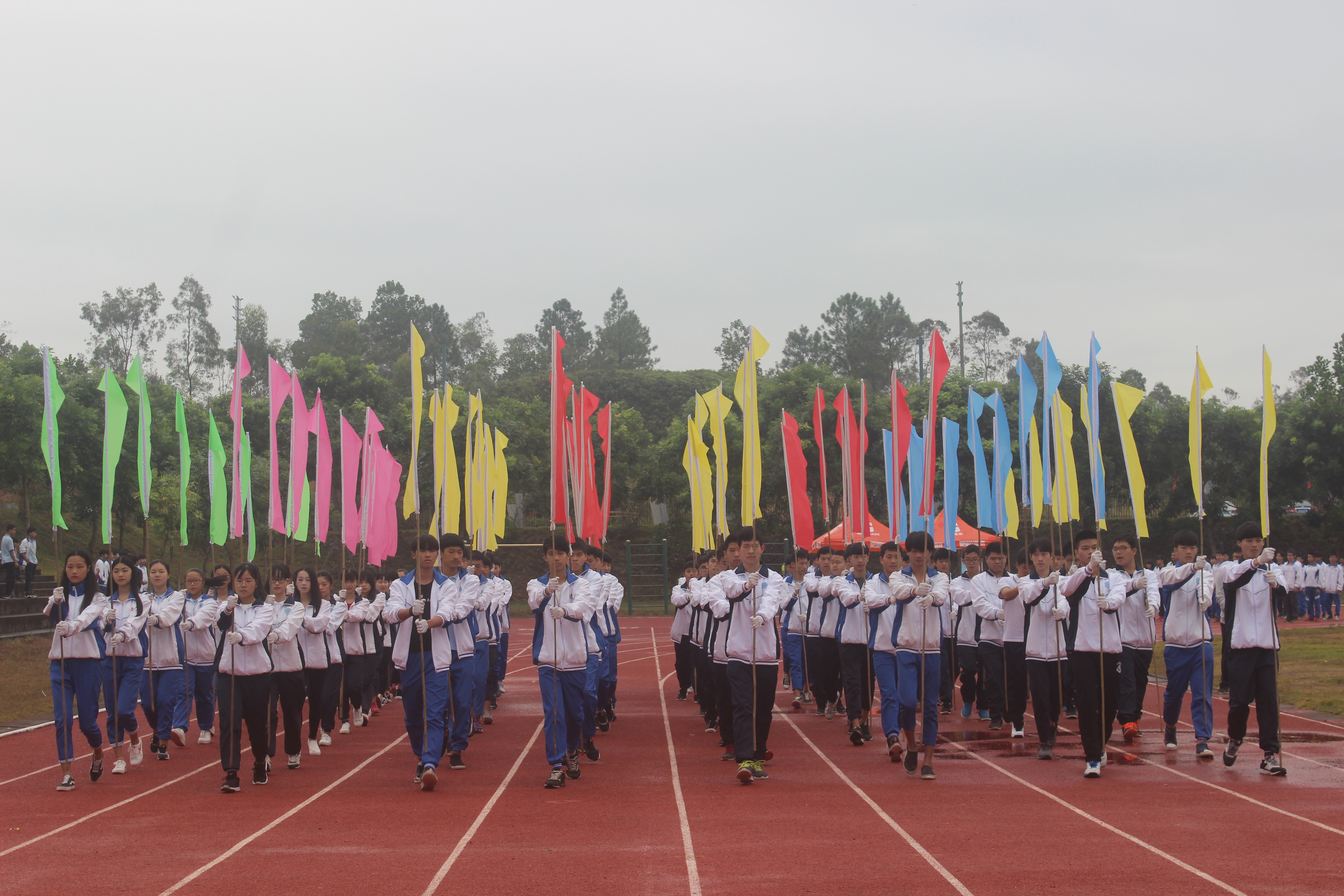 上午8点30分,伴随着熟悉的音乐,运动会入场式开始。由国旗队、校旗队、彩旗队、表演方阵队组成的仪仗队和七个系部组成的运动员代表队迈着稳健的步伐依次通过主席台,运动健儿们展示出奋发向上的精神状态,赢得主席台和看台上师生们热烈掌声,高级部在列队进场时穿插别具心裁的创意表演更是成为运动场上一道亮丽的风景线。