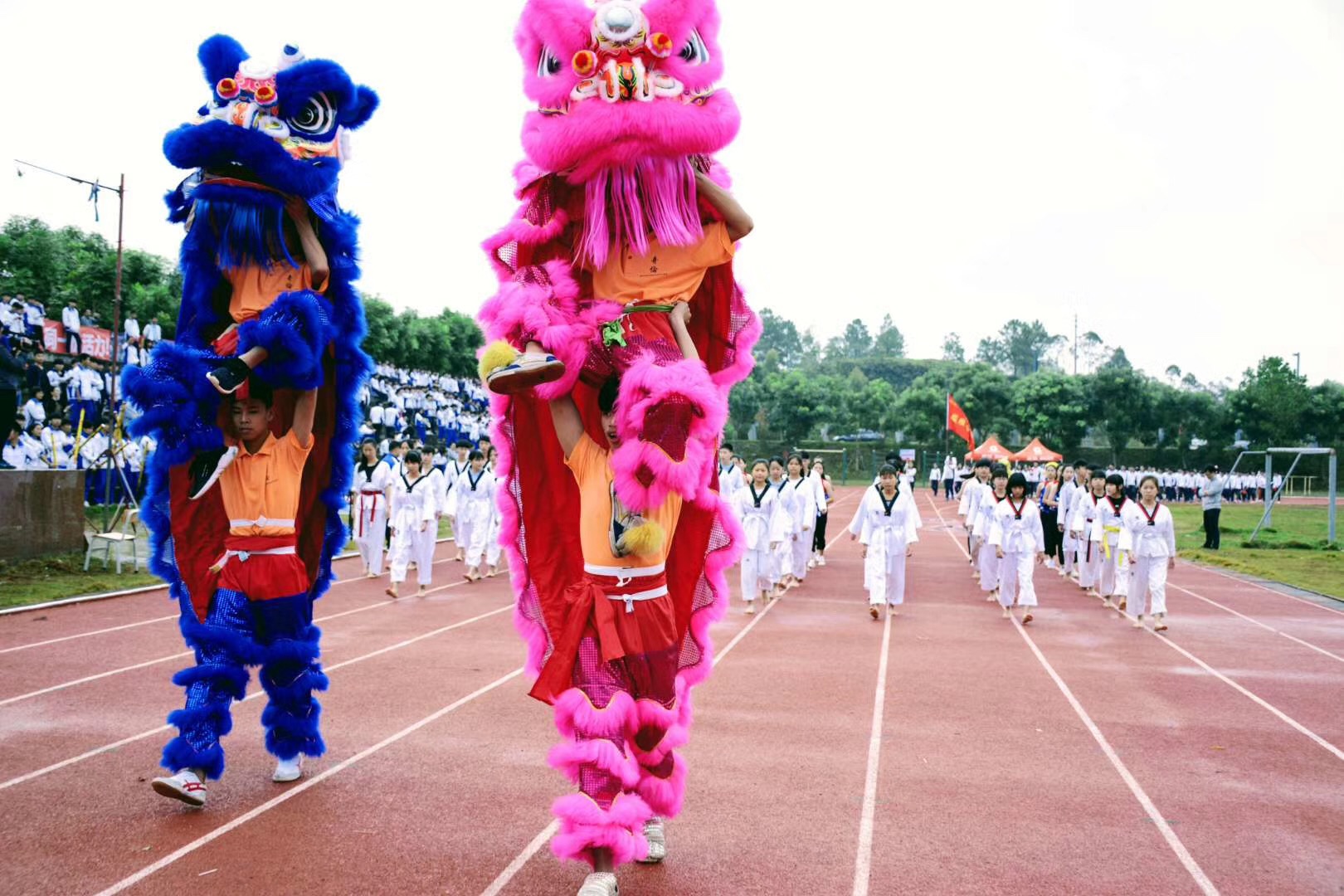 致辞完毕后,雷院长宣布阳江技师学院、阳江市第一职业技术学校2017年田径运动会开幕,表演方阵队开始了精彩的表演,学校舞蹈队表演的舞蹈以欢快的节奏、优美的动作展示了两校学子的青春与活力;跆拳道社表演的跆拳道动作整齐划一,一招一式颇具韵味,充分展现出武术的魅力;龙狮社的醒狮表演不断秀出的各种高难度动作让观众惊叹不已,醒狮在采青过程中吐出“更高、更快、更强”的竖幅时更是嗨翻全场,将气氛推向高潮。