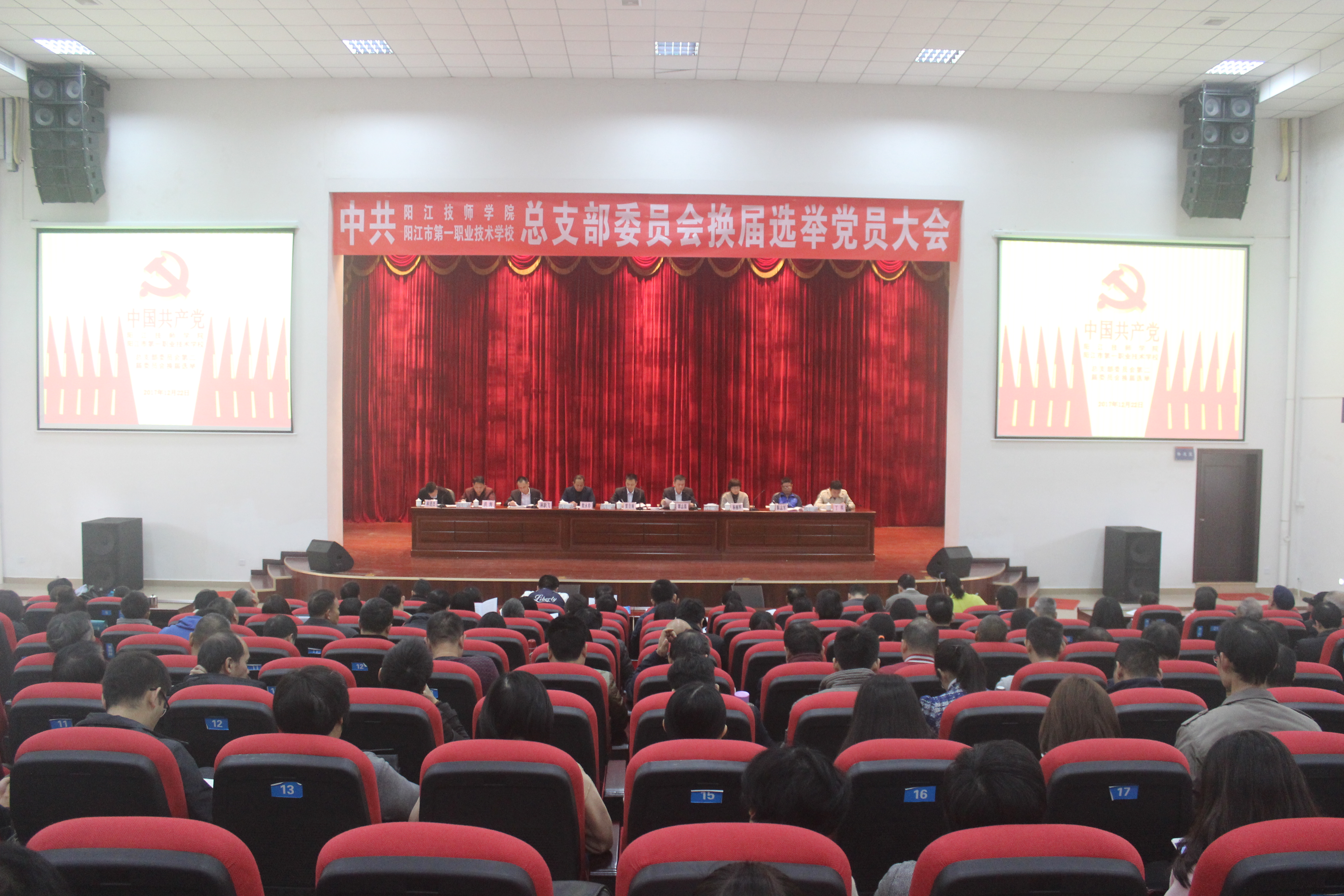 为进一步加强和改进学校基层党组织建设,充分发挥学校基层党组织的政治核心作用和战斗堡垒作用,按照上级党组织安排部署,2017年12月22日上午,中共阳江技师学院、阳江市第一职业技术学校总支部委员会换届选举大会在学校学术报告厅隆重举行。两校全体在职和离退休党员出席了会议。大会由两校党总支书记谭志葆同志主持。