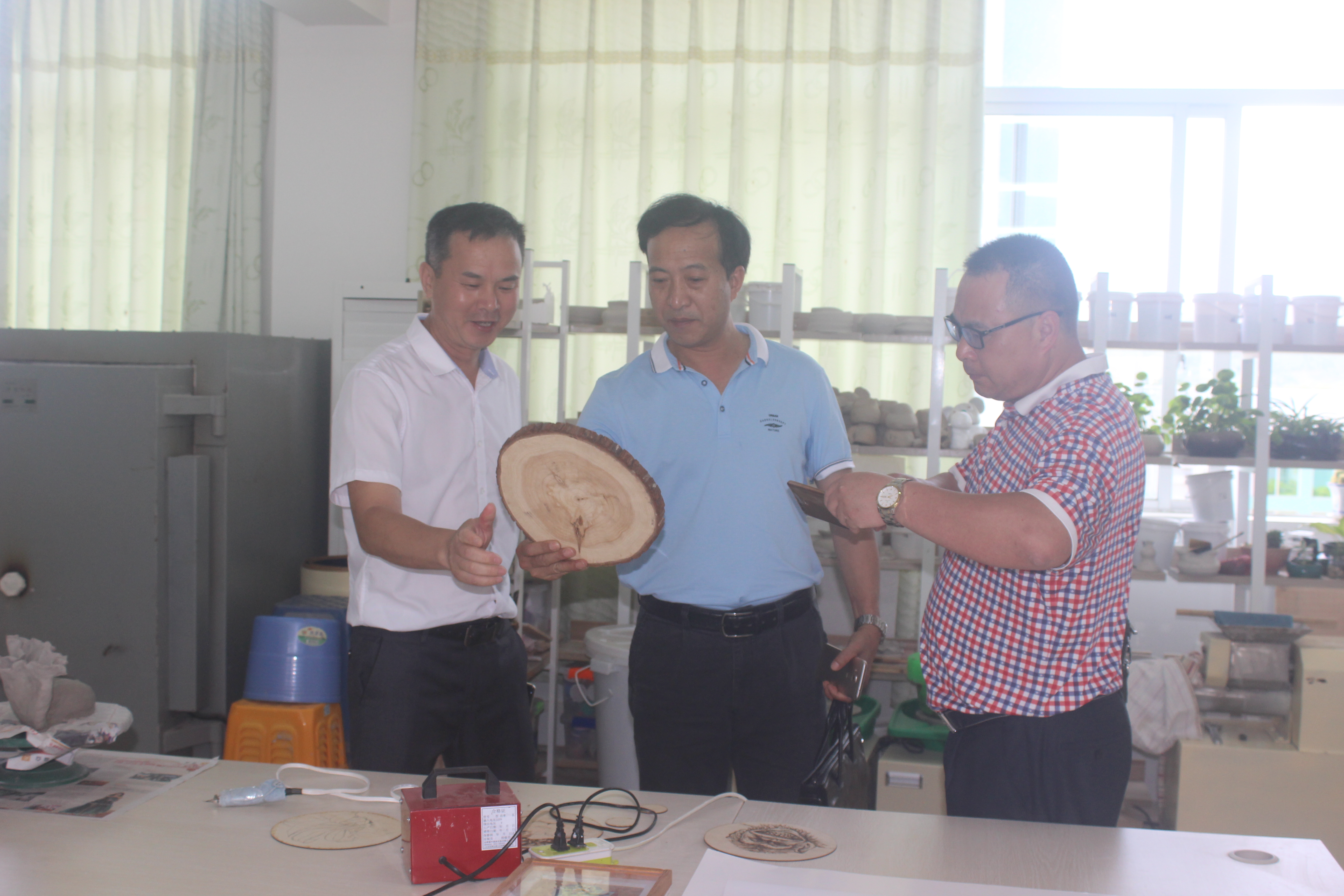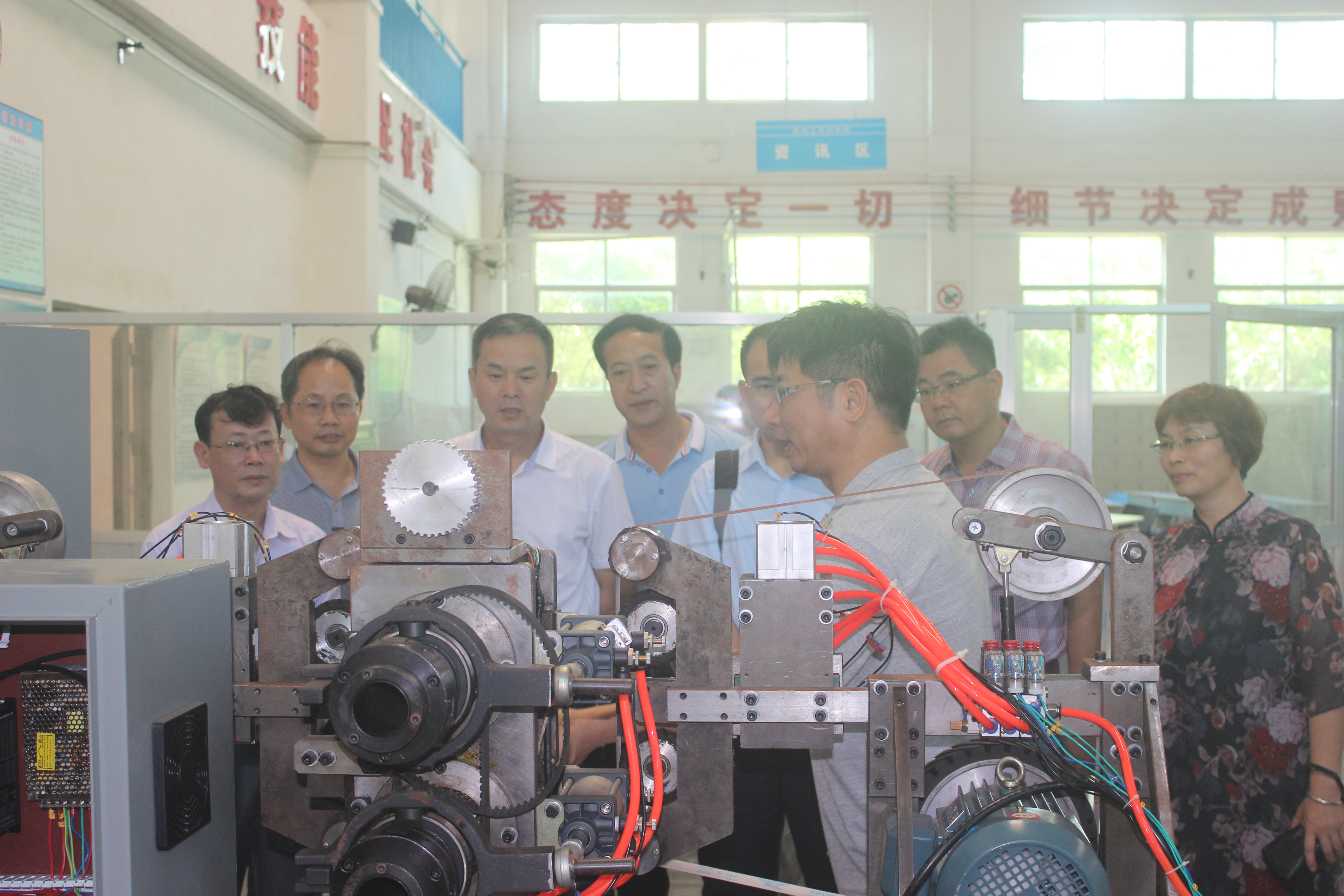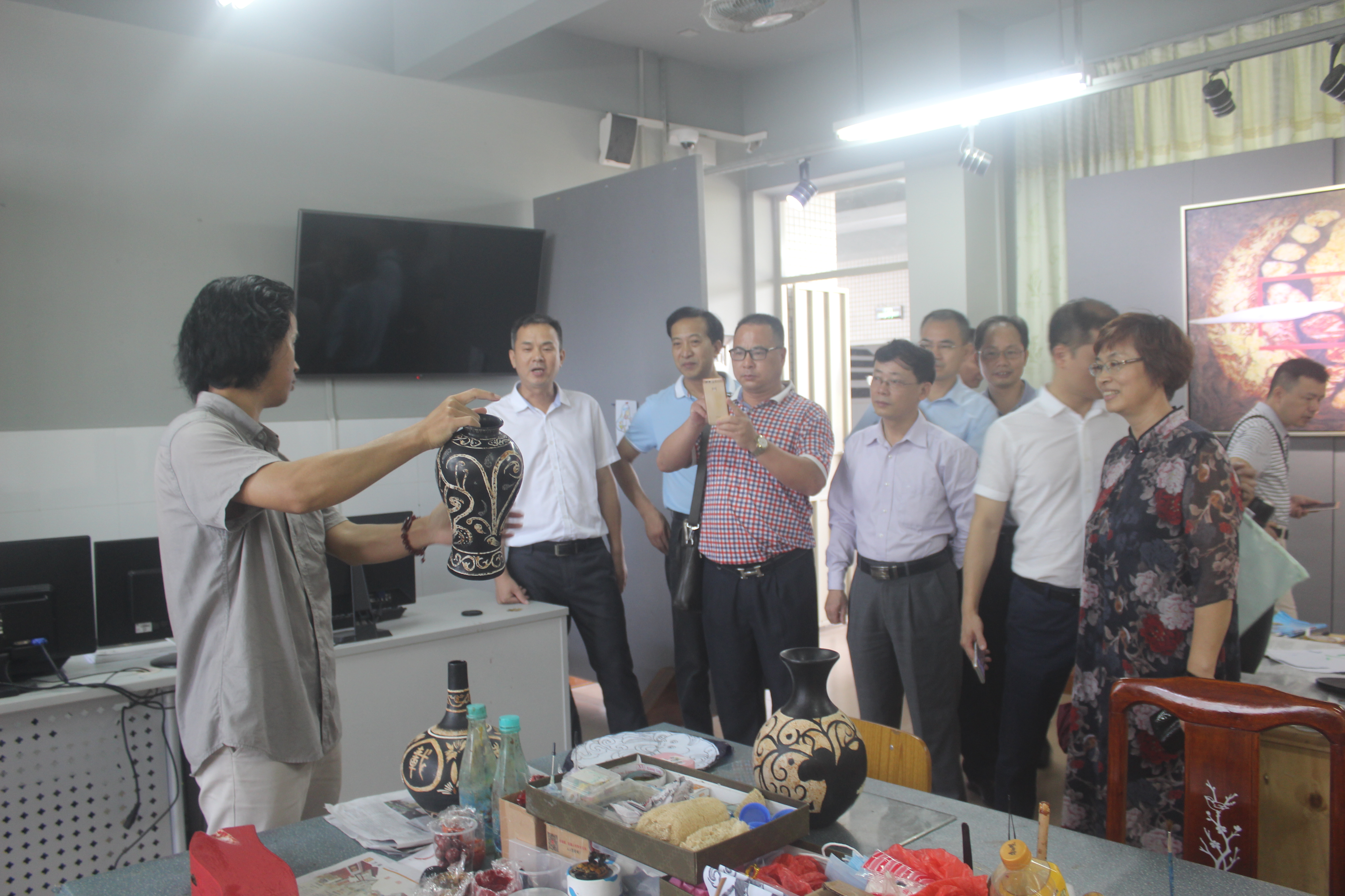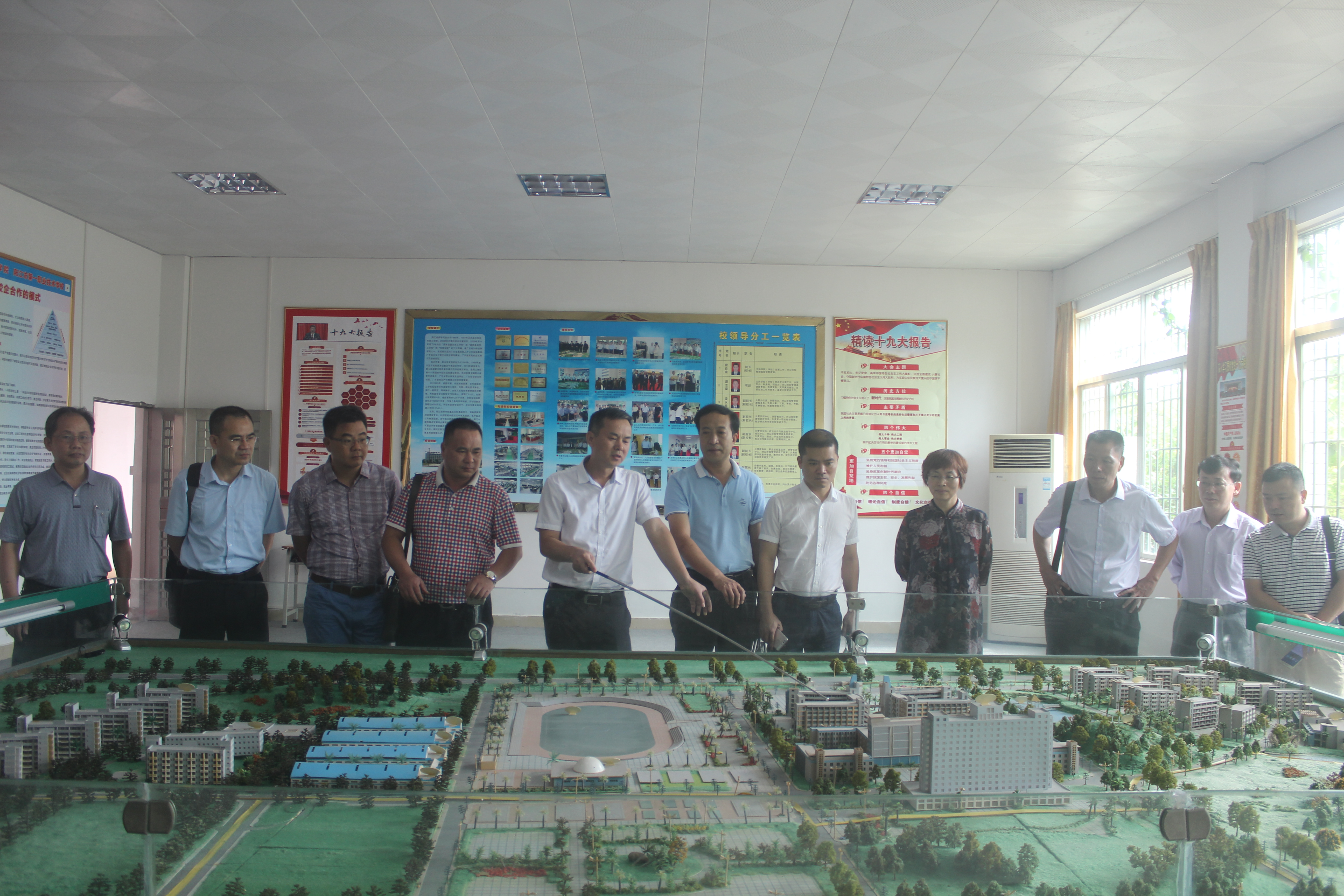 此次,2017年广东省中职学校校长高研班第二组由清远市清新区职校校长李锦秋、潮州饶平县现代职业技术学校校长黄少韩、汕头外语外贸职校校长陈树耀、梅州市大埔县田家炳高级职业学校校长邓裕声、台山市培英职校校长伍瑞群、汕头市林百欣科学技术中等专业学校校长陈庭照等六位校长组成。在实训中心,校党总支书记谭志葆在学校建设沙盘旁向调研组成员介绍了学校建设的整体规划、已建工程、在校生规模等情况。在谭志葆书记的引领下,调研组成员先后参观了我校的汽车维修实训车间、数控实训车间 、校企合作实训车间、影视实训室、广告设计实训室、漆器工作室、幼师实训等实训教学场所。在参观过程中,调研组成员对我校实训室的建设成果给予了高度的评价,特别是我校建设的影视实训室、广告设计实训室、漆器大师工作室的建设和教学工作给他们留下了深刻的印象。