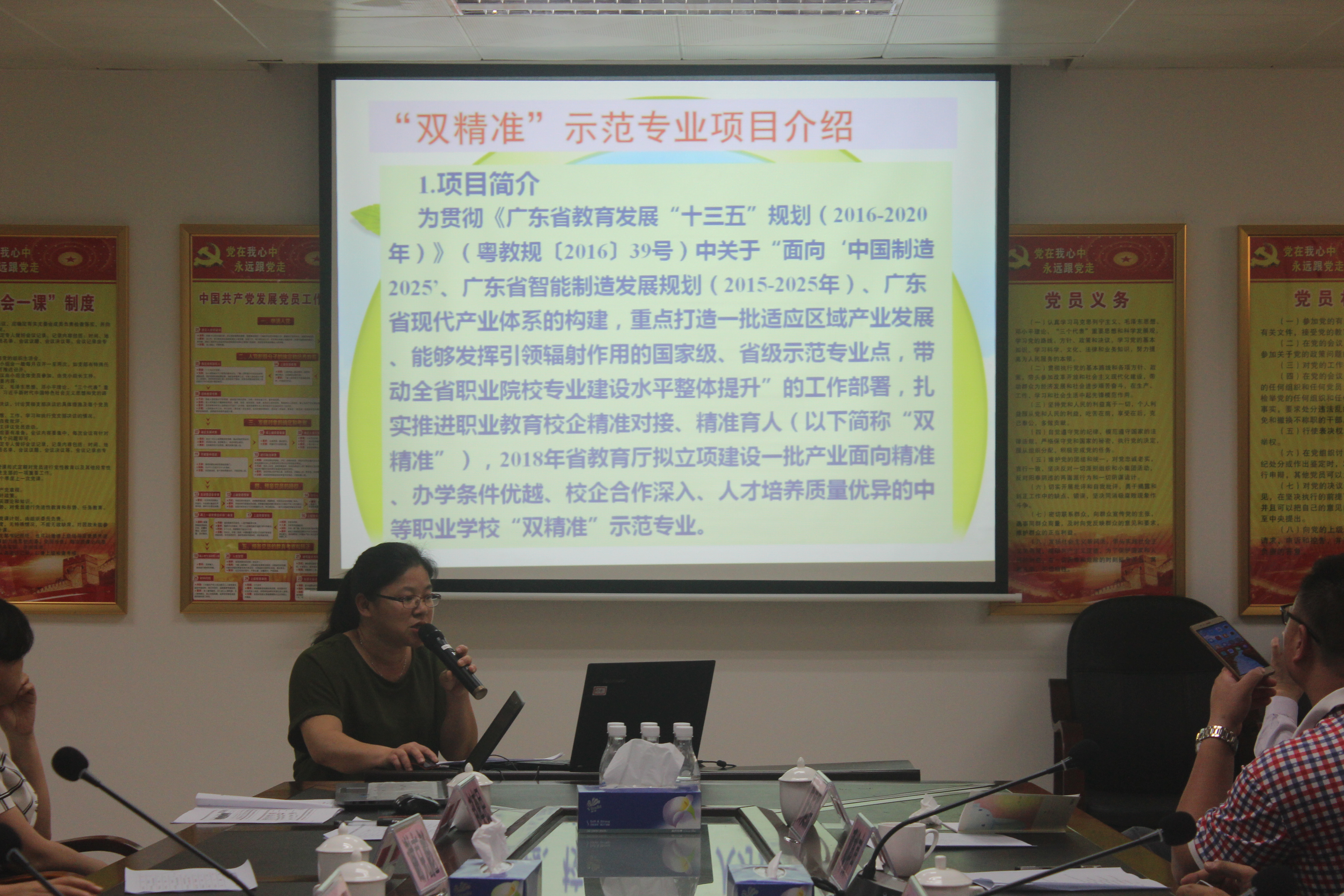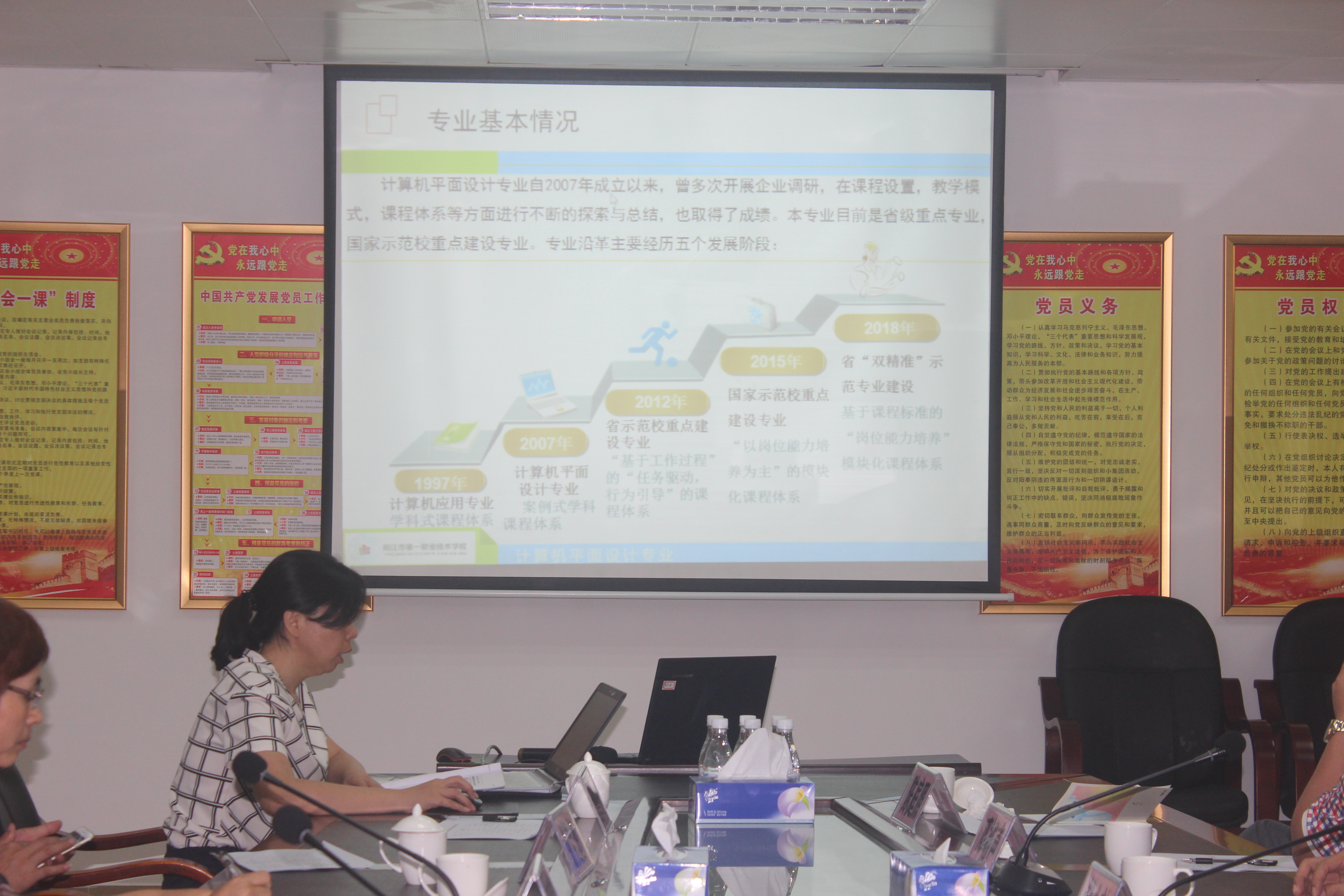 参观完学校的教学实训基地后,调研组成员及我校相关参会人员在综合楼大会议室举行座谈会,会上雷自南校长向调研组汇报了我校在基础建设、教学管理、招生就业、校企合作、校园文化建设等工作方面的进展和情况。随后,罗世姬、赵奕民两位老师分别向调研组汇报了幼师、平面设计两个“双精准”专业的建设情况。
