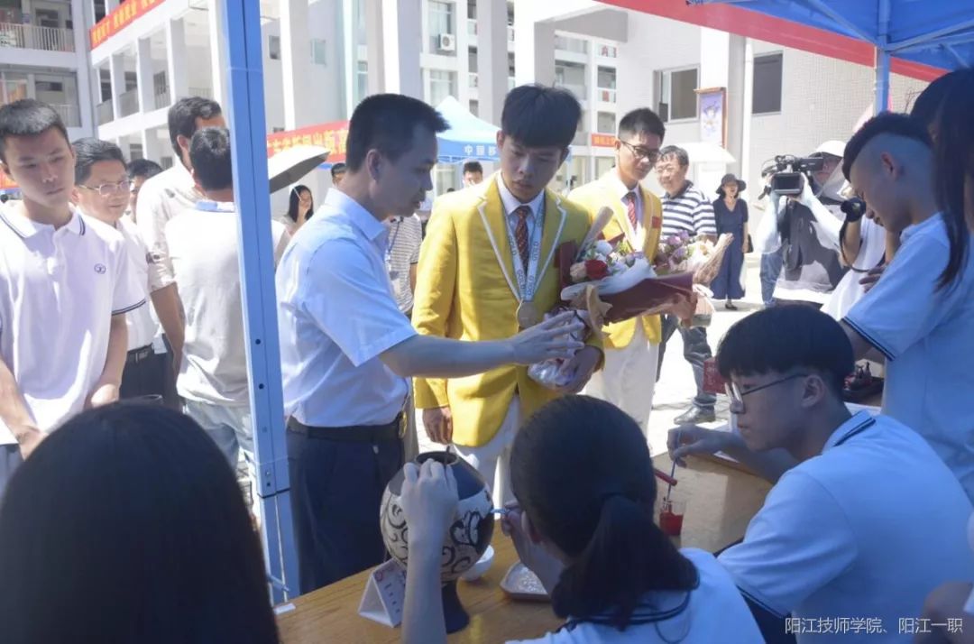 当天,除了开展场内主题宣讲外,还组织开展了丰富多彩的场外活动,如技能成果展示、《技行天下》影片展映、签名墙签名以及我校特色专业展示。其中在烹饪专业在展台,参观领导、获奖选手以及代表们先后品尝了我校学生做的各类糕点;同时让大家耳目一新的还有我校的漆艺、布艺、烙画和幼教等专业。场外活动结束后,我校学生现场向世赛获奖选手赠送烙画。