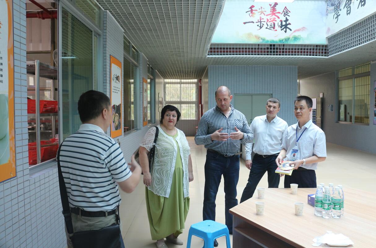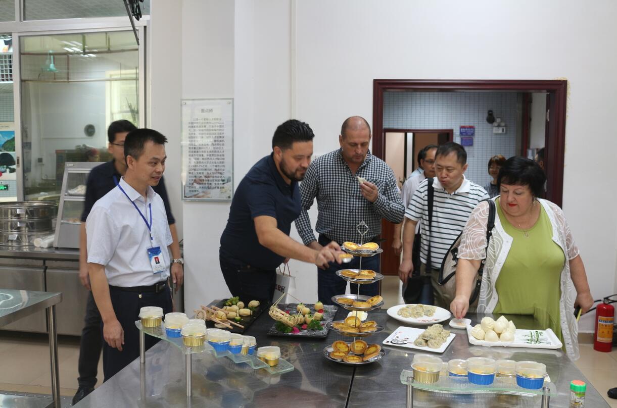 最后一站,考察团来到了我校烹饪实训室,一阵阵香气迎面扑来,各式中、西式糕点吸引住俄罗斯外宾的眼球,我校烹饪教师上周参加全省餐饮行业中式面点师职业技能大赛的获奖作品—象型莲藕酥获得俄罗斯客人的一致赞赏。当烹饪专业蔡梦贤老师介绍到桌上的点心全是出自我校学生之手、早早地起床准备材料分工合作,专门给远方的客人准备的时候,在场的俄罗斯外宾无不表示感激!并再次竖起了大拇指!