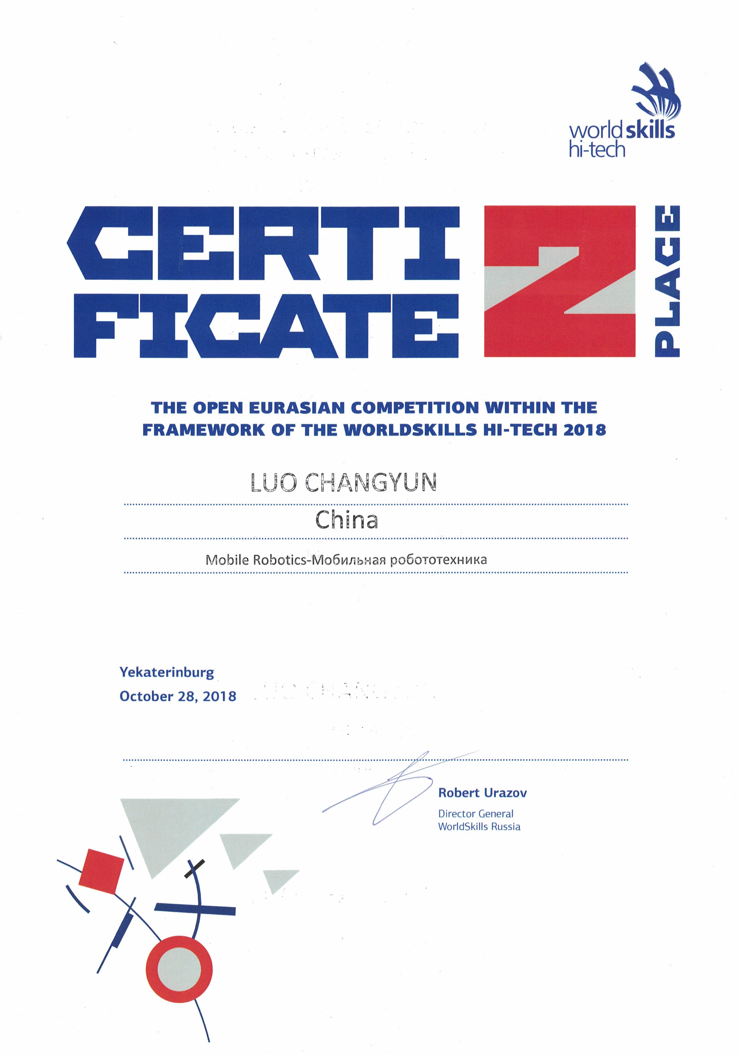 继2018年7月在中国青岛进行的国家技能发展与技术创新大赛移动机器人项目(中国赛区决赛+俄罗斯欧亚世界技能公开赛选拔赛)中,以全国第三名的成绩赢得了代表中国参加10月底在俄罗斯进行决赛的资格后,再次在俄罗斯的总决赛摘下一枚银牌,实现了学校乃至全市技能竞赛项目的一个历史性突破!
