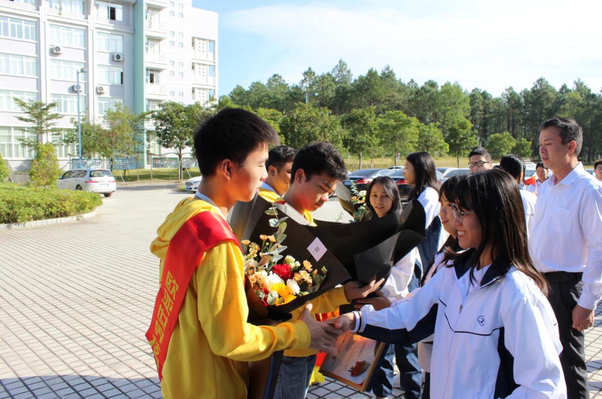 2018年11月1日上午9点,我校赴俄罗斯参赛代表团载誉归来,学校师生早早地在学校综合楼一楼广场等候,迎接参赛代表团的是一束束鲜花和持续不断的掌声,现场欢欣鼓舞、振奋人心!