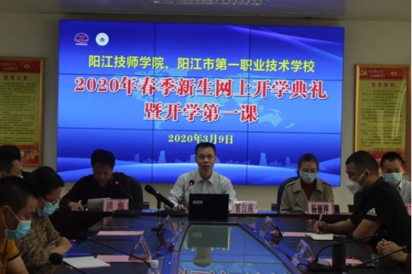 3月9日上午10:00,阳江技师学院、阳江市第一职业技术学校迎来了一次特殊的“云”相聚——2020年春季新生网上开学典礼暨开学第一课。校长雷自南、副校长杨丽萍、林跃飞、陈志军、洪海、各系部主任、相关科室主任以及新生班主任代表参加典礼,新生班主任以及700多名新生通过直播平台全程在线观看。典礼由洪海副校长主持。