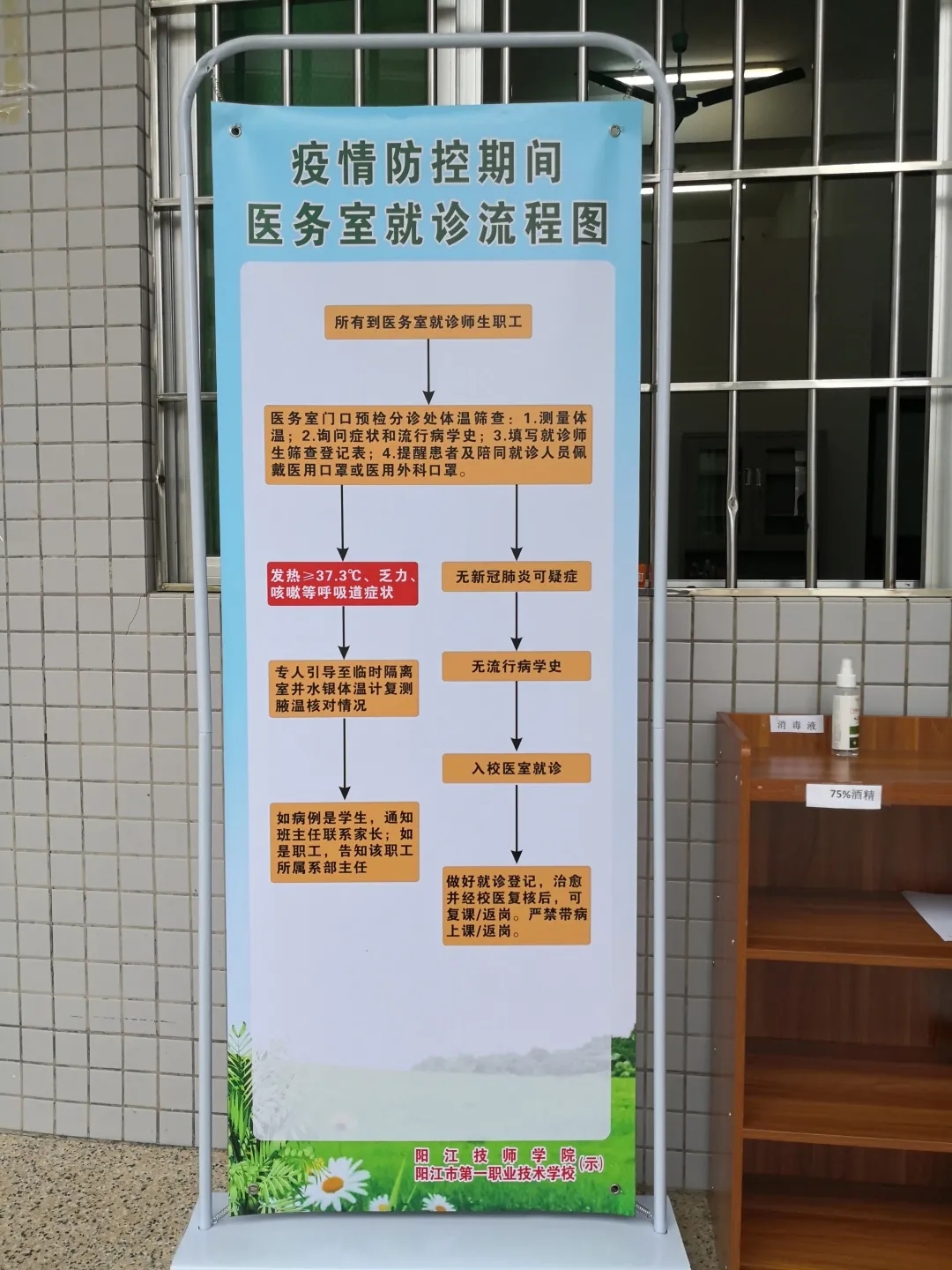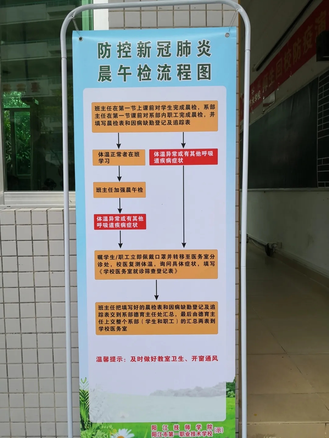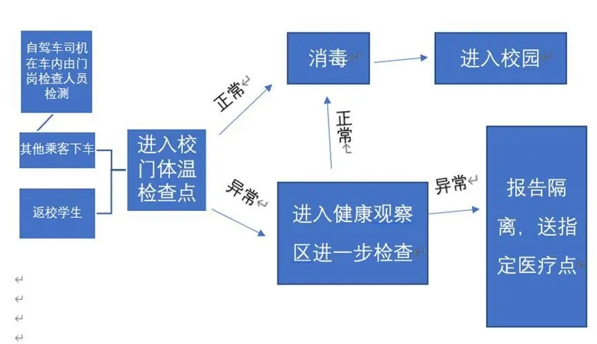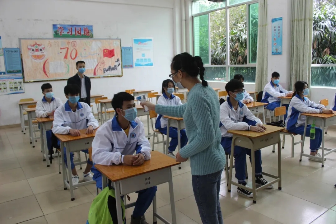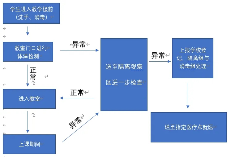 在进入教学区域前,每位师生都要按照“七步洗手法”洗手消毒,班主任(或第一节课任课老师)在教室门口对每位进入教室的学生进行体温检测和健康观察,如学生在上课期间出现发热、咳嗽等状况,老师应立即终止上课并让所有人员留在教室内,上报疫情监测组,由隔离组把学生带至观察室进一步检查,如出现疑似病例,则由隔离组和消毒组对教室和密切接触者进行后续处理。