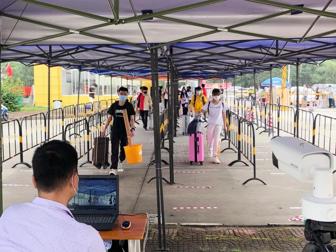 戴着口罩,背着行囊,学生们搭乘校车返校。接着,便是上交返校健康申报卡、测量体温、洗手消毒等流程,学生们积极配合,井然有序。同时,学校根据市领导关于学生返校工作指示精神,充分考虑安全因素,避免学生在校外长时间排队等候,设立快速进校通道;进入校园内设置足够大的测温区,采取二次测温办法,自动测温与手动测温相结合,并且全区域搭建了遮阳帐篷,避免学生长时间在太阳底下暴晒引起中暑或不适。学校对学生的人文关怀由此彰显。