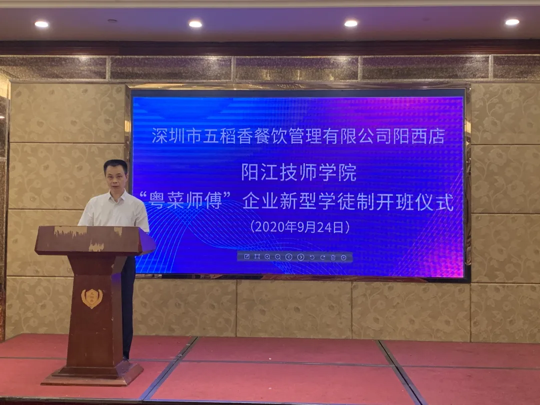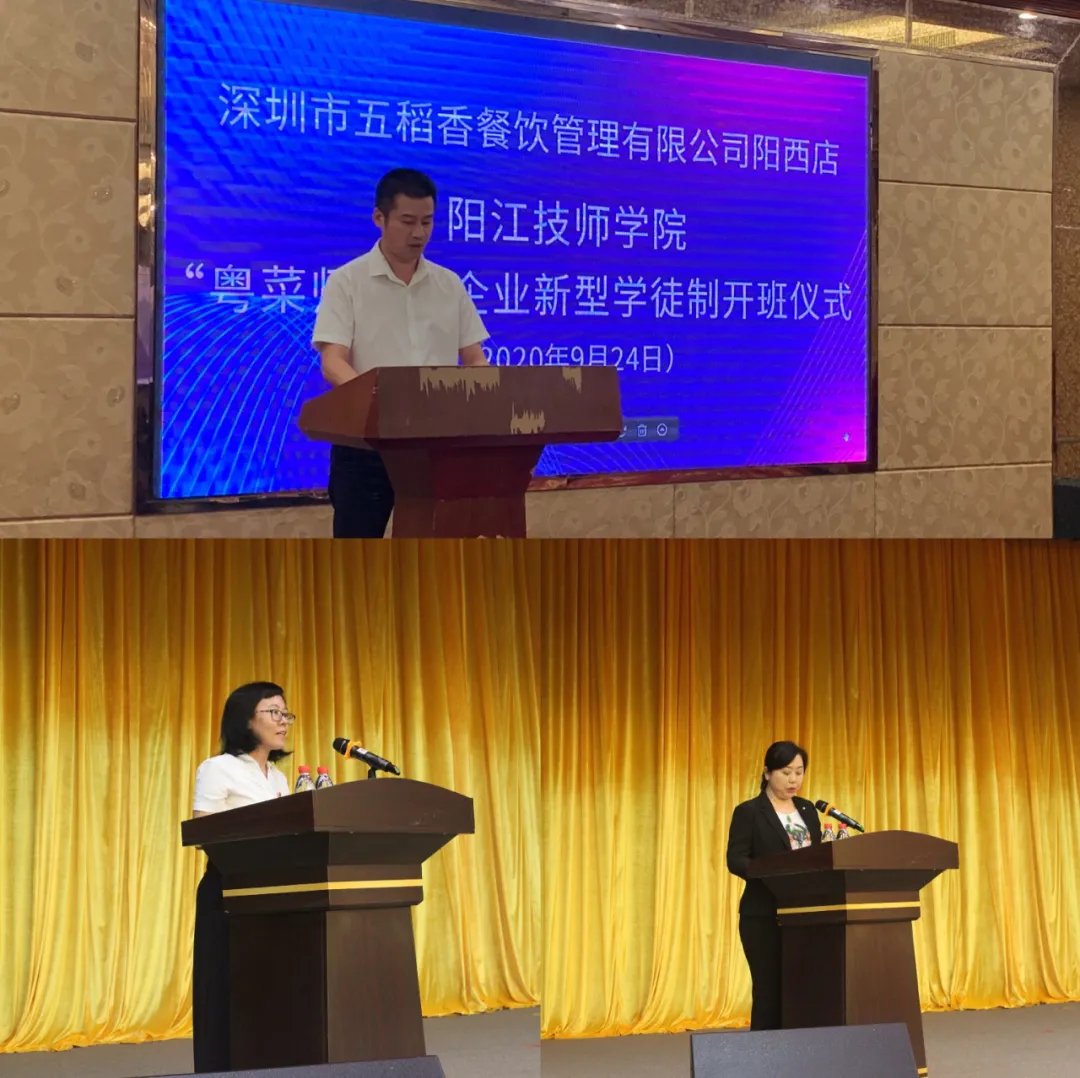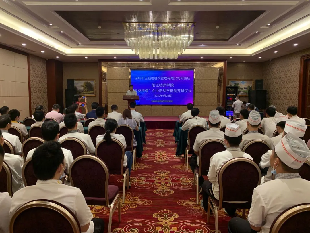 为贯彻落实中央、省、市关于开展企业新型学徒制工作要求,加强我市企业技能人才队伍建设,深化产教融合、校企合作,进一步发挥我校服务区域经济的作用,9月24日至25日,我校分别与深圳市五稻香餐饮管理有限公司阳西店、广东广青金属科技有限公司举办新型学徒制开班仪式,主要合作开展以初级中式烹调师、面点师、电工高级工、技师为目标的新型学徒培养工作。校长雷自南、副校长陈志军、企业代表、市、县(区)人社部门相关同志、培训学员等参加仪式。