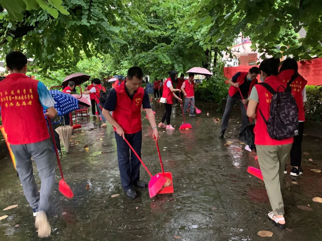 活动中,我校志愿者们克服下雨天气,发挥不怕脏、不怕累的精神,分别对路面垃圾、杂草等进行了清理。