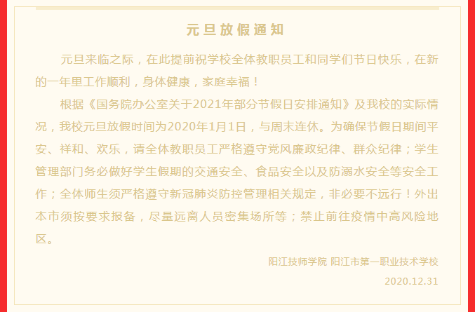 关于阳江技师学院、阳江市第一职业技术学校元旦放假的通知