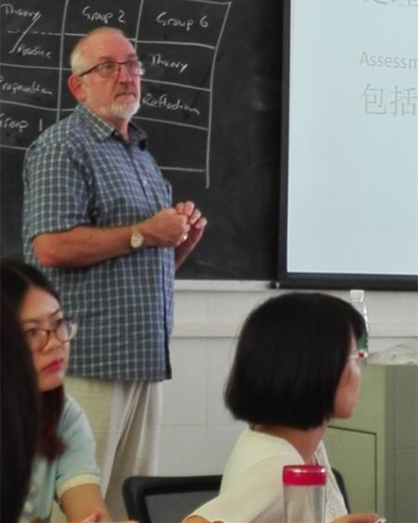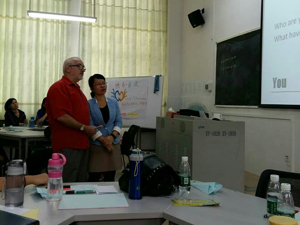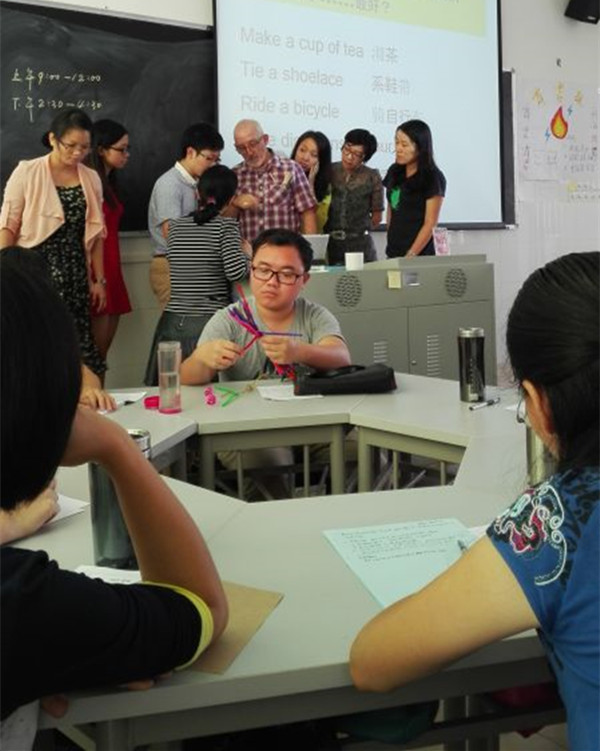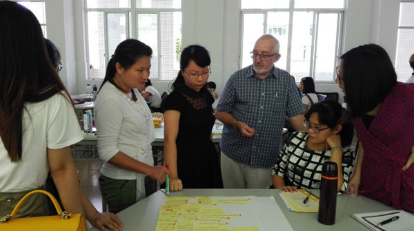 在为期七天的培训时间里,英国Dr. Neil Denby教授全程使用英文授课,采取小班互动式教学方式,运用多种以学生为中心的情景教学方法进行培训(如下图)。培训中,老师们学习了“以学生为中心教学法”的九项基本原则。参加培训的老师表示,“以学生为中心教学法”是与传统教学法截然不同的教学方法,在整个教学过程中,强调学生是主体、教师是主导。这种方法能充分调动学生的主动性和积极性,在教师的引导下放开思维,通过小组讨论、团队协作等活动来解决问题、学习掌握知识。