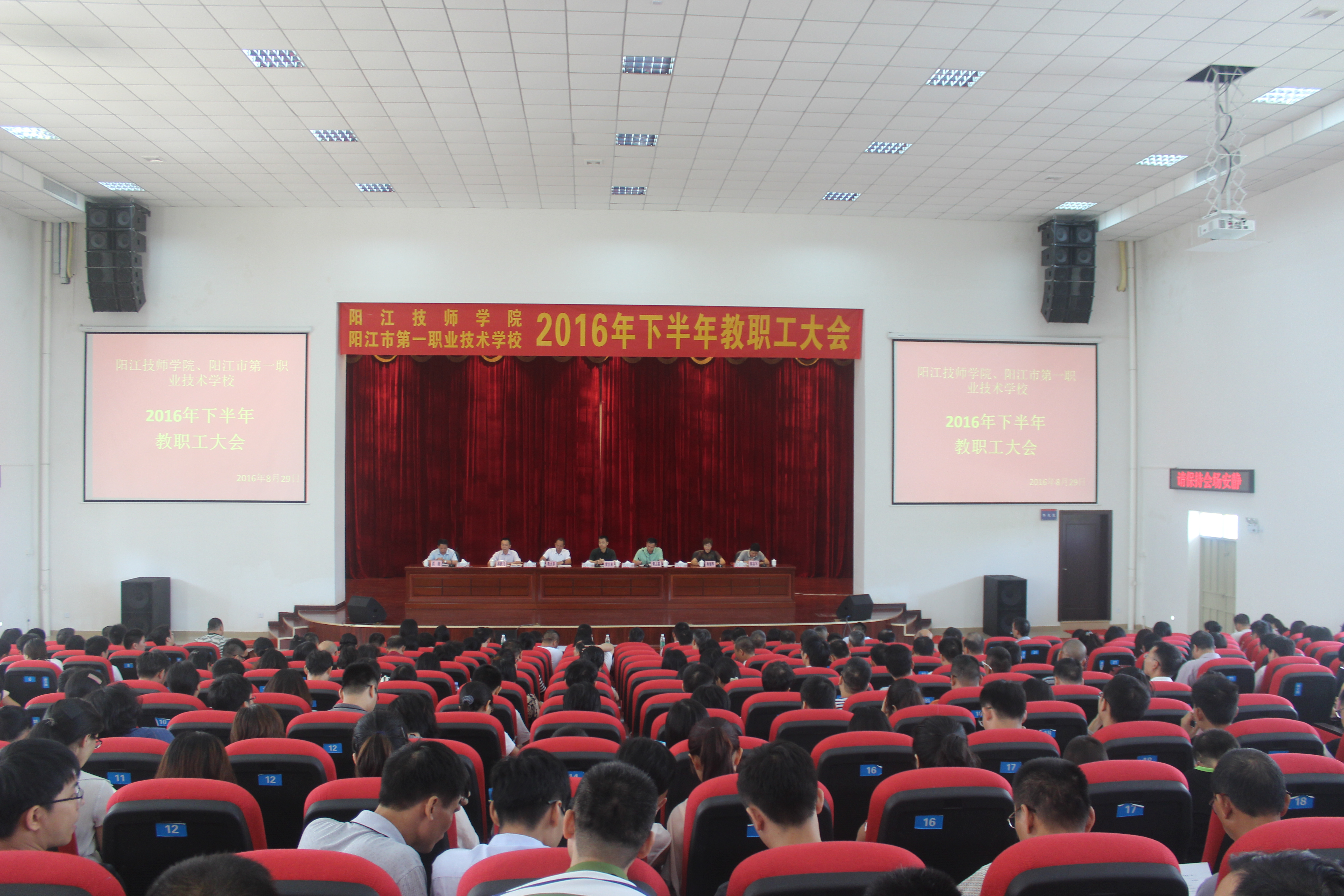 此次大会是我校新学期开学前期的一项重要工作,目的是谋划布局2016年下半年各项教学管理工作的建设和发展,会上,大会主持人谭志葆书记首先向全体教职工介绍了学校通过招才引进的10位新教师,随后杨丽萍、陈志军、洪海等三位副校长就2016年下半年各自分管的教学、后勤管理、学生管理等工作进行了安排。最后,校长雷自南就2016年下半年学校的各项工作进行全面部署,指明了下半年着力狠抓的重点工作,一是要多措并举,切实加强师资队伍建设。二是要居安思危,确保稳定招生规模。三是深化改革,不断强化办学特色。四是出台措施,提高班主任管理水平。五是规范管理,努力实现科学治校。为能够将2016年下半年学校的五大重点建设工作做好,校长雷自南同时向全体教职工提出了几点要求和希望,一是加强学习,提升素质。二是顾全大局,加强团结。三是强化责任,狠抓落实。四是为人师表,全员育人。五是摆正心态,努力工作。