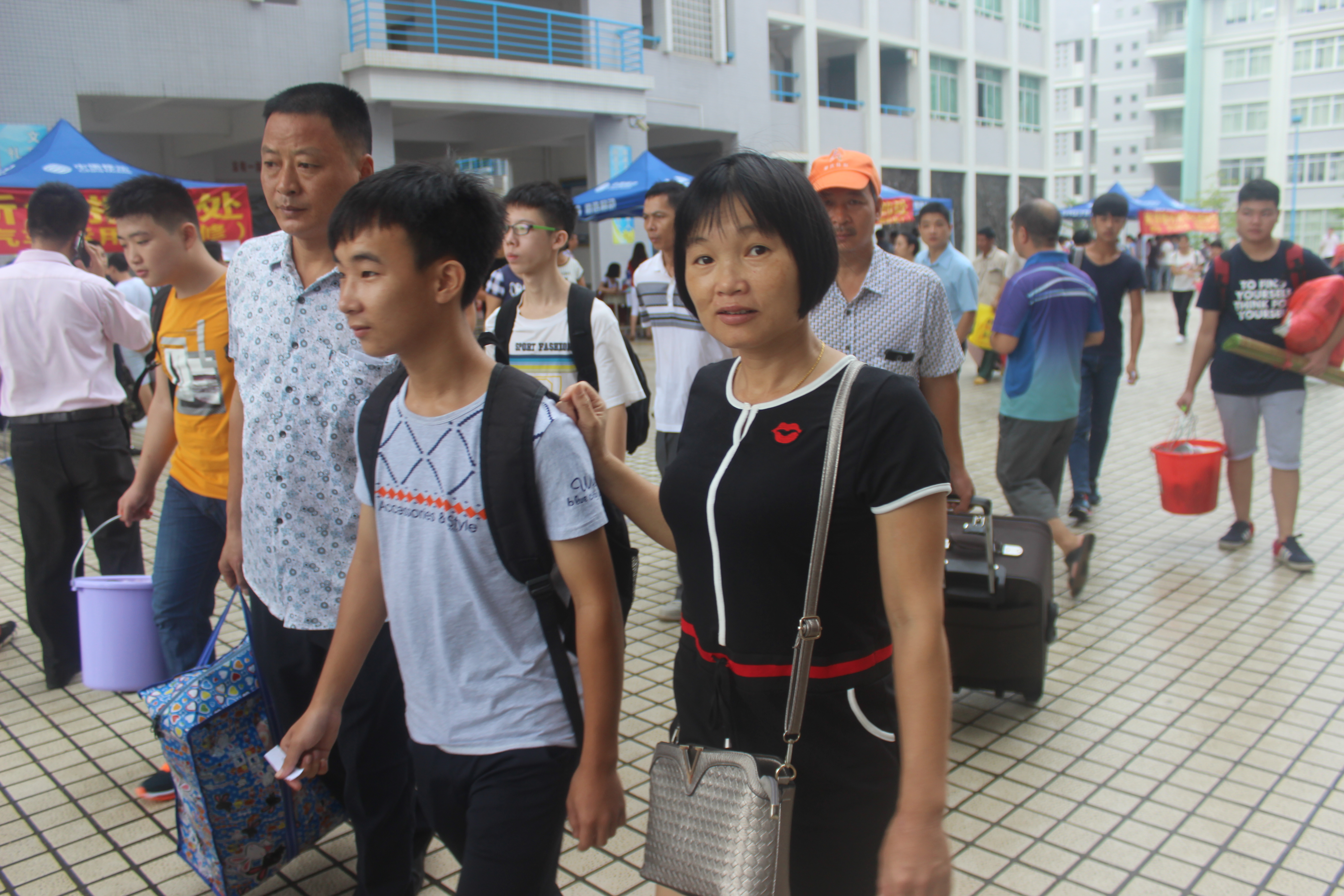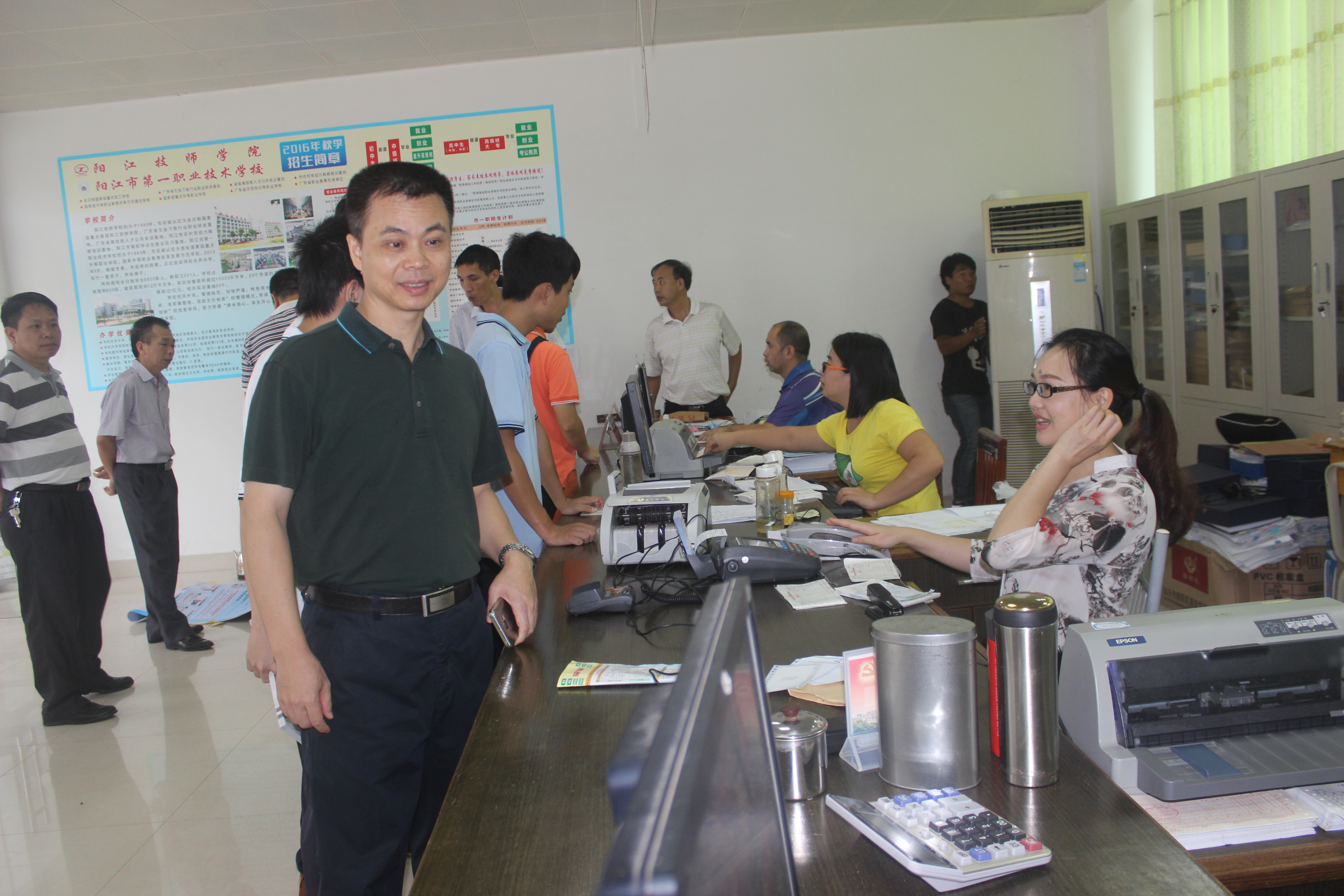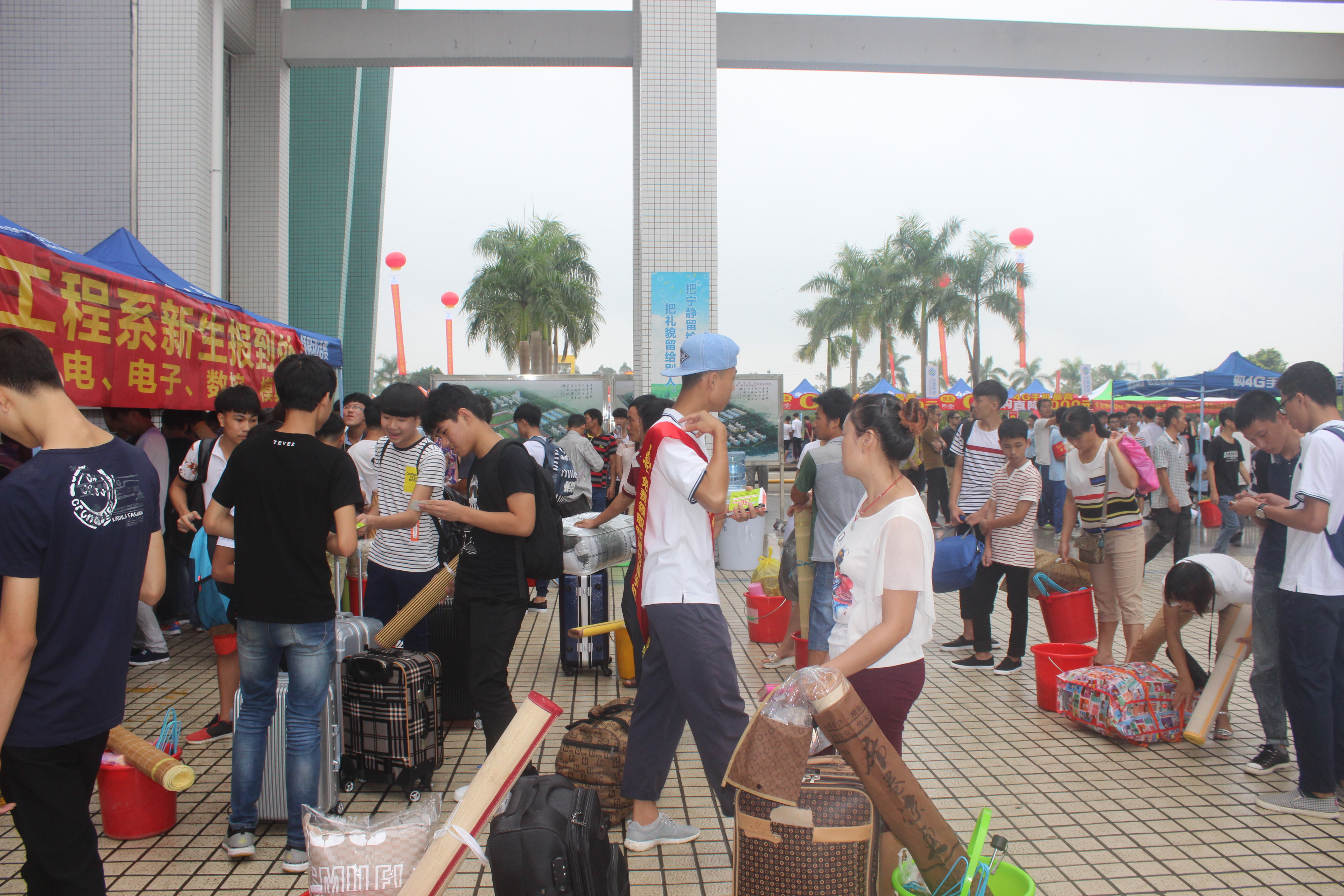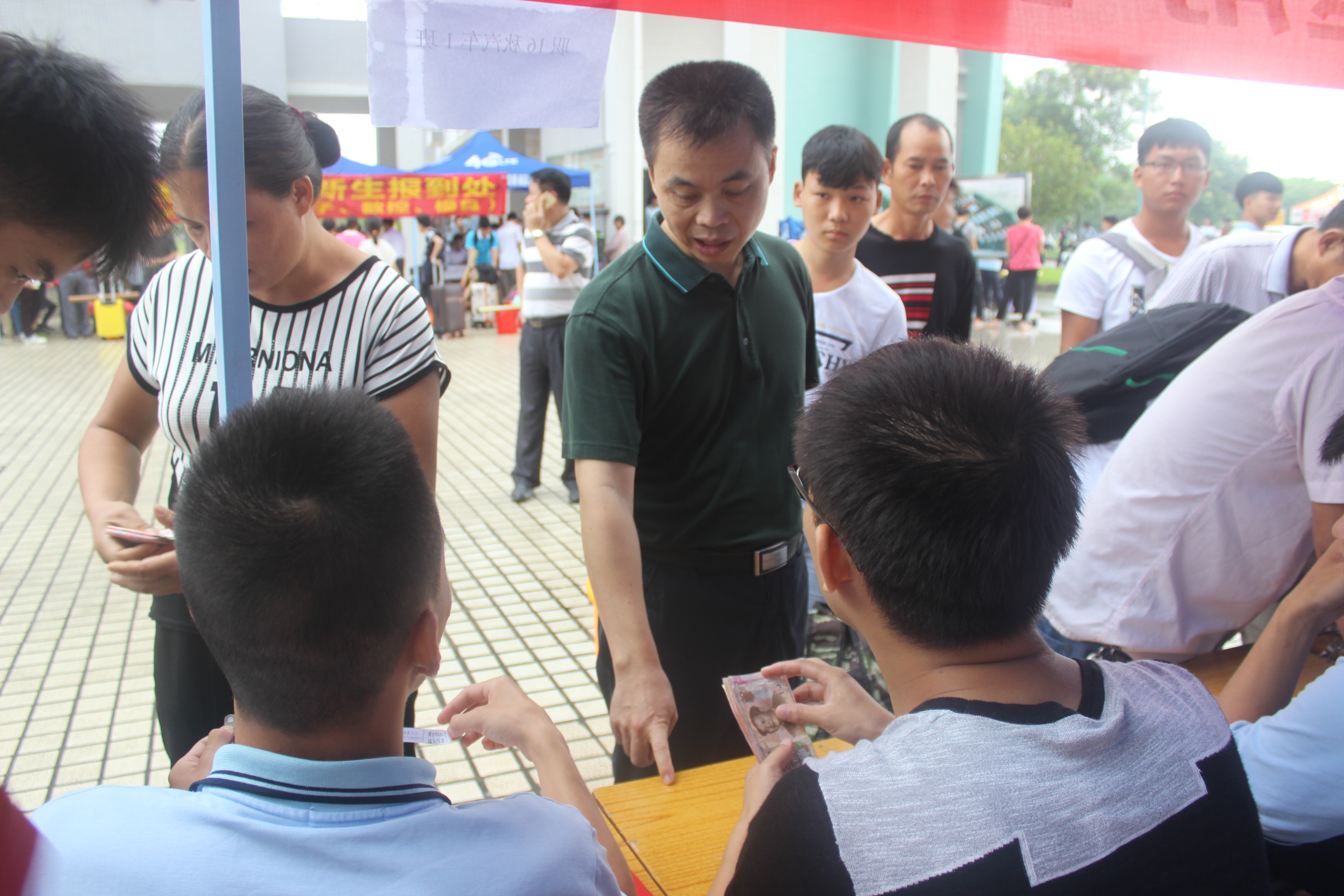 每年的九月都会有一大批的新鲜血液注入到阳江技师学院、阳江市第一职业技术学校这个大家庭之中。9月5日上午,校园中到处都是手拿通知书、报名单的新生,他们有的在耐心排队等候,有的在各学院报名处询问相关事宜。家长们也在不远处拖着行李等待着自己家的孩子完成各项程序。而为了使新加入的新生能安全、顺利、圆满地报到注册,我校做好了迎新接待的全面准备工作,校长雷自南、校党总支书记谭志葆等校领导更是到接待现场,亲自视察接待工作情况和指导各科室、部门做好新生接待的工作。