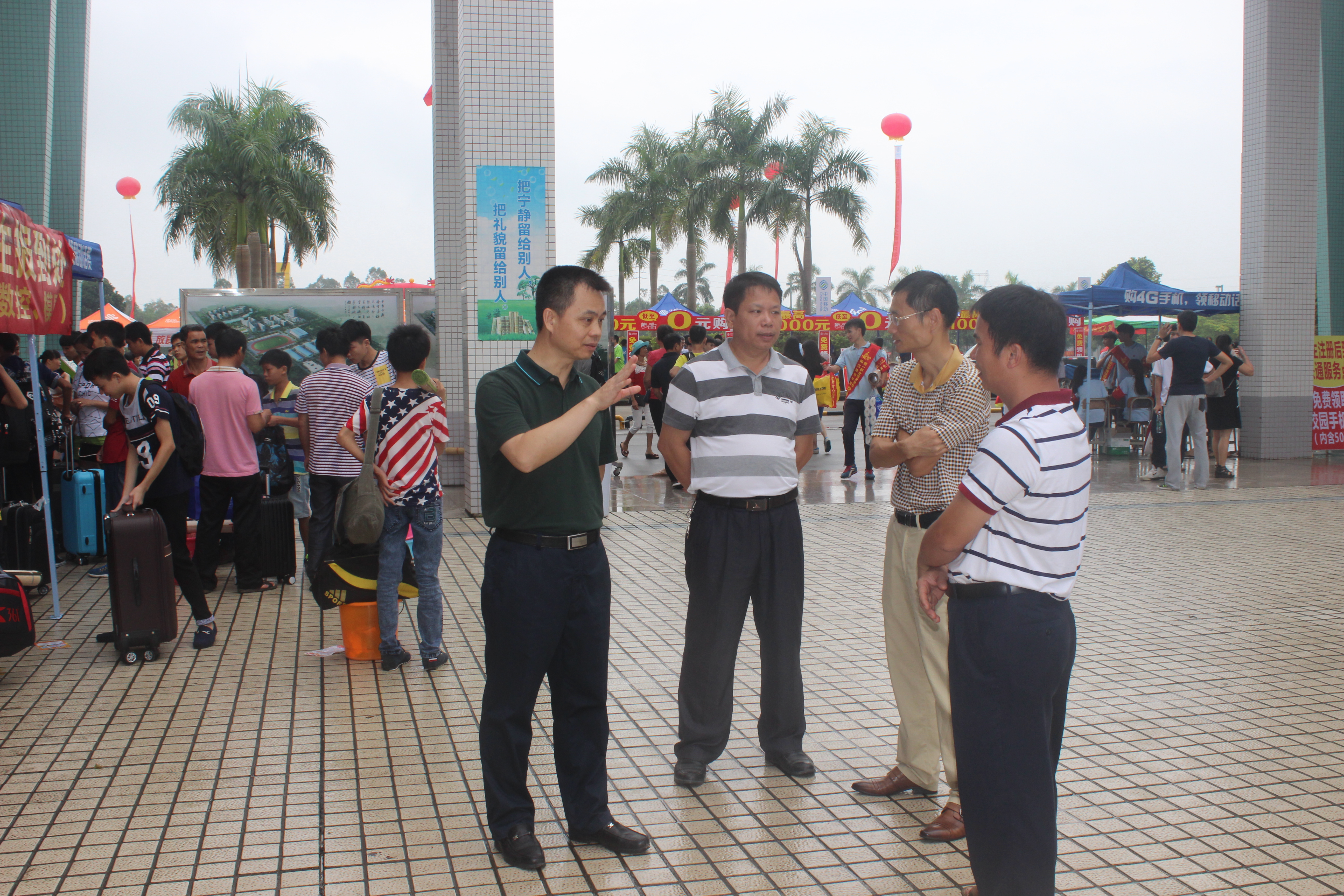 最引人注目的是学校的校长雷自南、校党总支书记谭志葆等领导,他们早早便到达接待现场,视察了解新生接待工作的具体情况,并亲自指导各科室、系部做好接待工作。在接待现场,校长雷自南时不时到各系部的新生接待大本营向接待老师了解新生接待是否顺利、学生回校是否已办好饭卡、家长是否满意等问题,在得到肯定回答后才离开,他甚至亲自到饭堂,检查饭堂的饭菜是否够量够质、是否安全卫生。在谈到新生接待工作的重要性时,雷自南校长指出新生接待工作的质量是展现一个学校形象的关键,更是一个学校办学质量的一项重要指标。