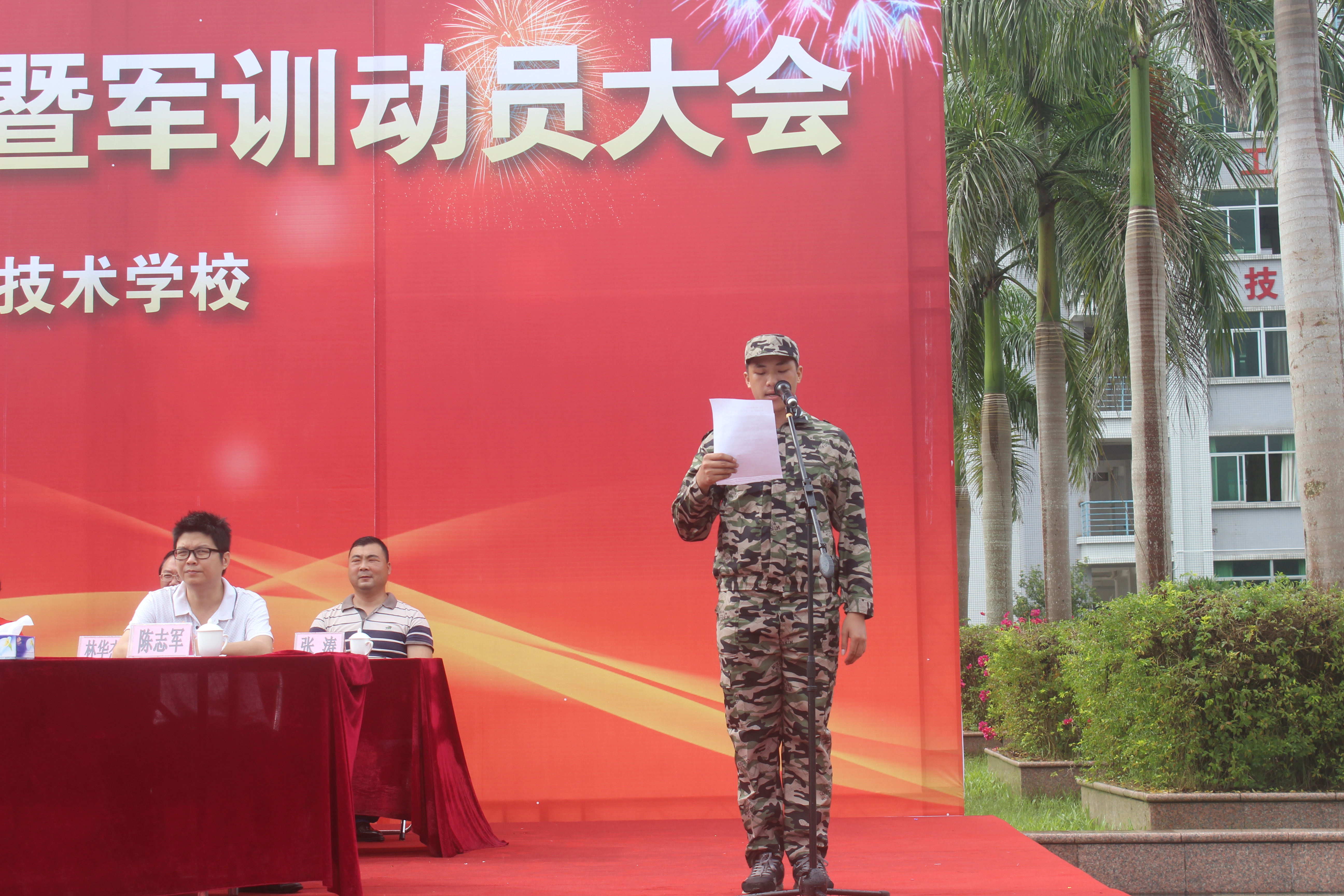 此次秋季新生开学典礼暨军训动员大会,我校邀请了阳江市国防教育训练基地的军官到场参加,为接下来新生的军训工作进行安排部署。动员大会上,分管学校管理工作的副校长洪海首先向全体新生提出了在校学习及军训期间应遵守的校纪校规、法律法规等要求。随后,学生代表上台发言,他代表全体新生表示在今后的学习中刻苦练就技能,培养精益求精的“工匠精神”,在军训中不怕苦、不怕累,坚决完成军训任务。