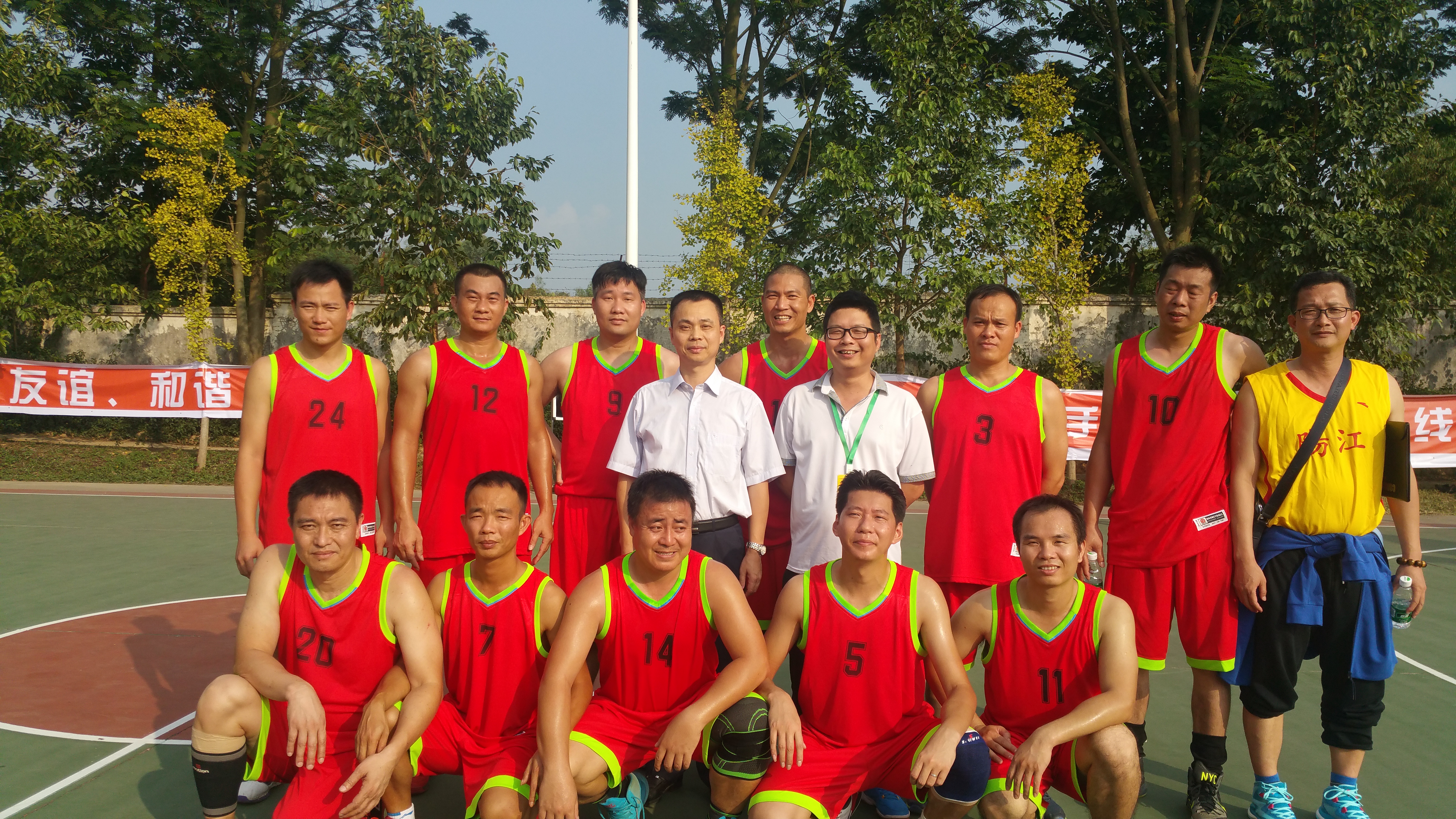 (雷自南院长、陈志军副院长与学院篮球队员合影)