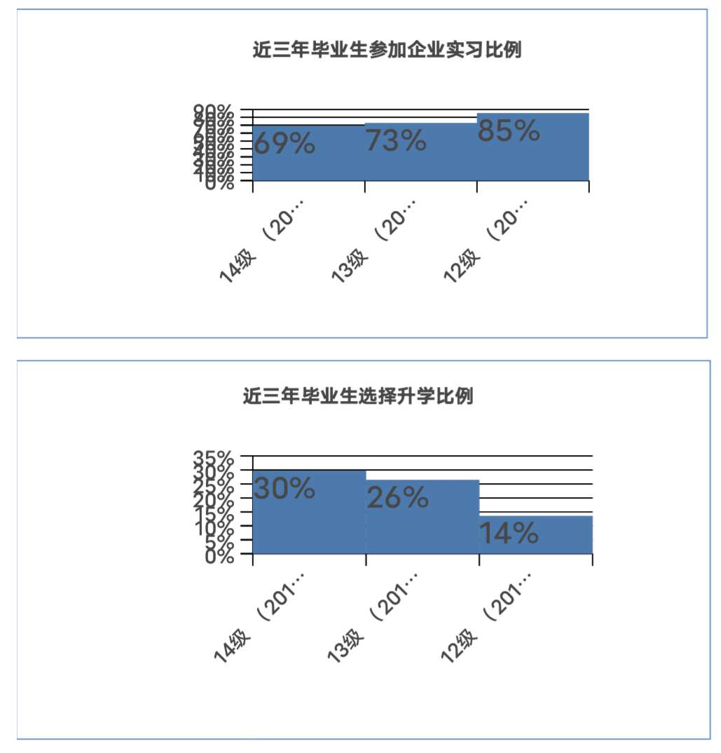 我校本学年度毕业生参加实习比例为69%,升学比例为30%,从趋势图对比可以看出,随着社会的发展学生和家长对提高中职学生学历的期待越来越明显。